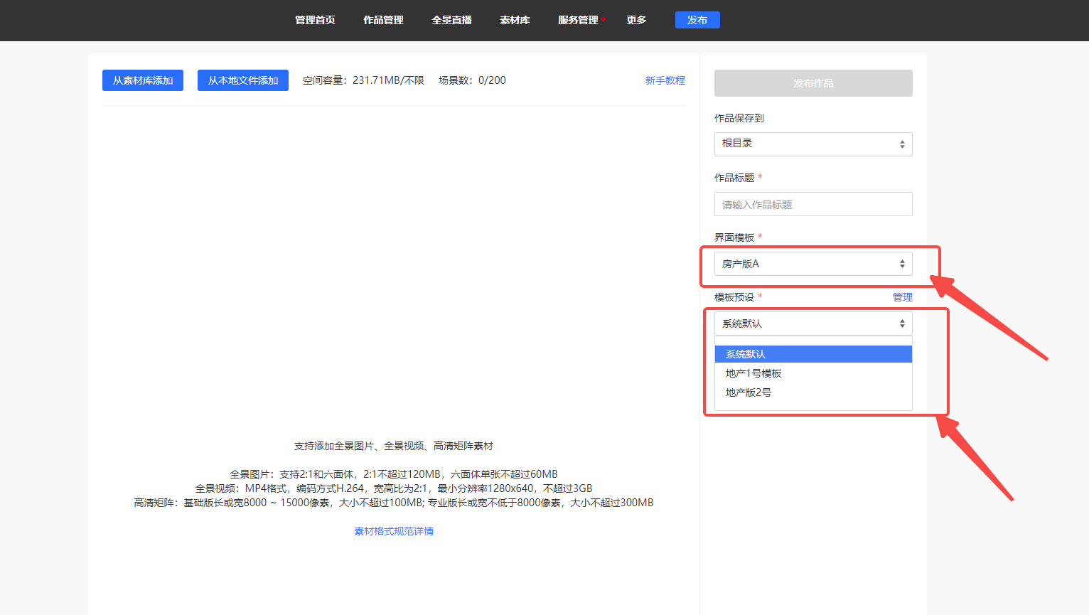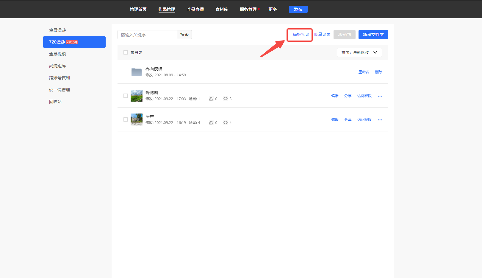 用户点击“作品管理——720漫游(工具2.0)——模板预设”。即可进入到模板预设界面进行设置。