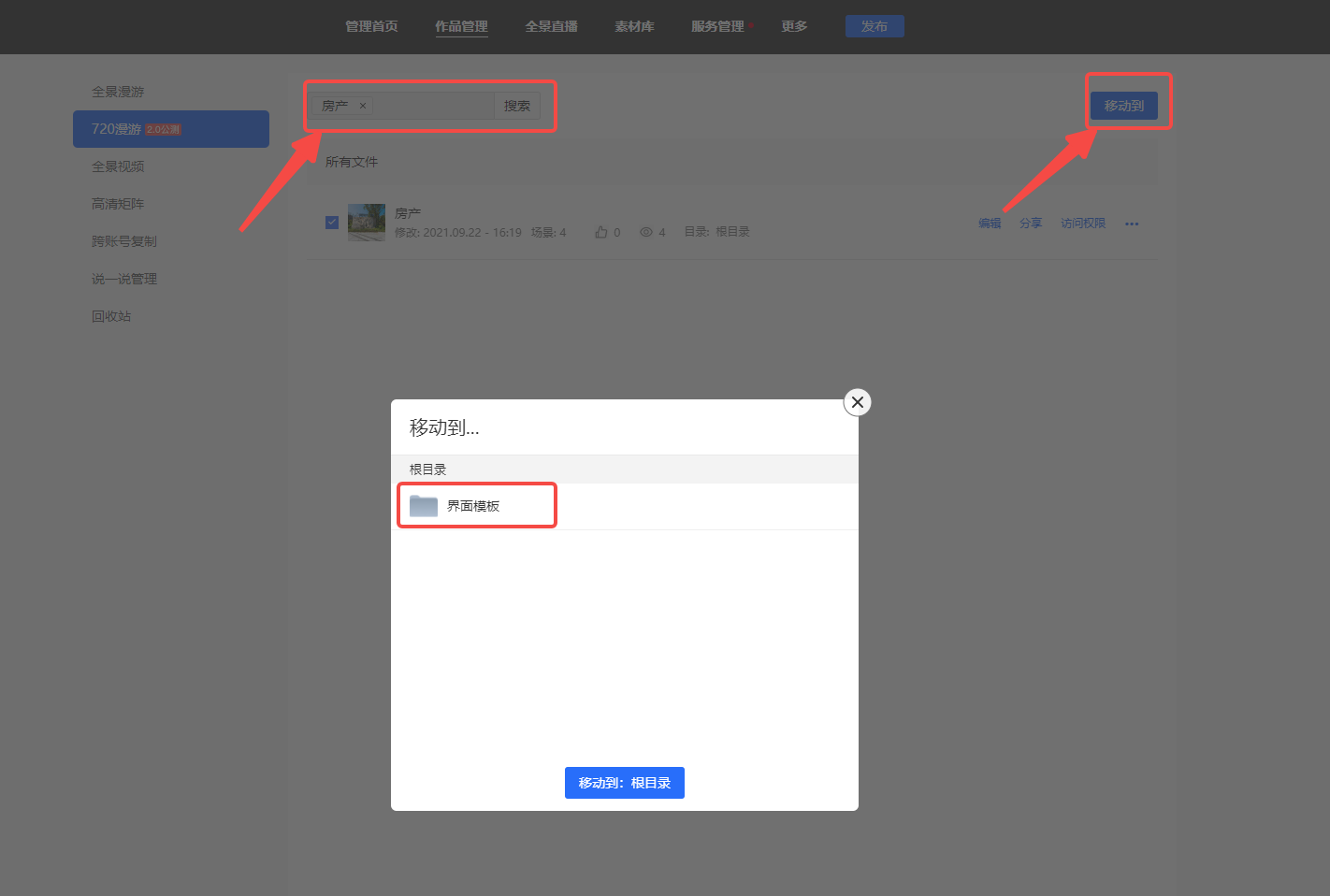 (2)作品管理中搜索作品后,支持选择作品并进行“移动到”操作。