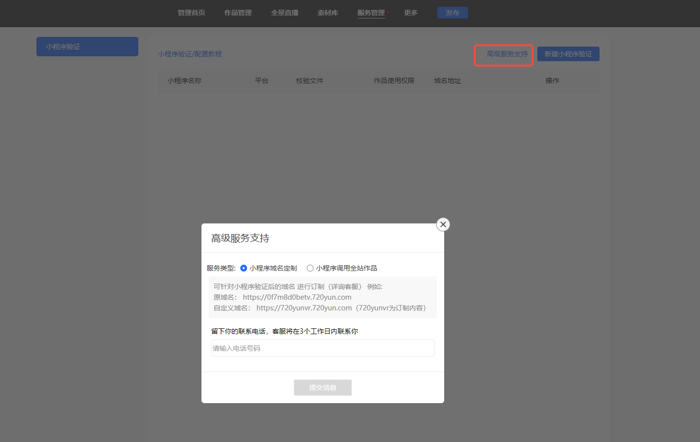 此项服务为高级服务,需要成为专业版会员,完成信息登记后,客服会及时联系您进行小程序域名定制。