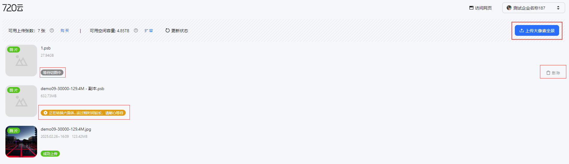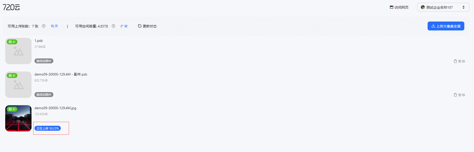 1. 若可用张数或空间容量不够,请先购买或扩容后,方可上传成功;购买或扩容后,数量更新有短暂延迟,请手动更新状态。上传成功后,按照切完后的碎片图文件大小来扣除空间容量。实测一张 28GB的原图,上传成功后,仅占用 1.07GB的空间容量,碎片图文件大小跟图片的像素有一定关系。大像素作品产生的流量,目前暂不额外收费。