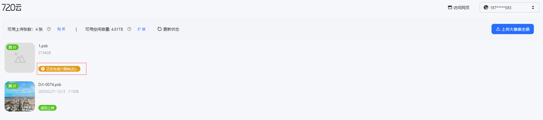 点击右上角【上传大像素全景】,从电脑本地选择需要切图上传的素材图片。若大像素上传张数不足,或可用空间容量不足(可用张数或可用空间容量在左上角查看),需先预先购买张数或扩容后,才能正常选择图片切图上传。购买或扩容操作可在当前客户端即可完成,也可以在 720 云网页端预先购买,购买后,若数量未更新,请点击【更新状态】更新数量或容量。