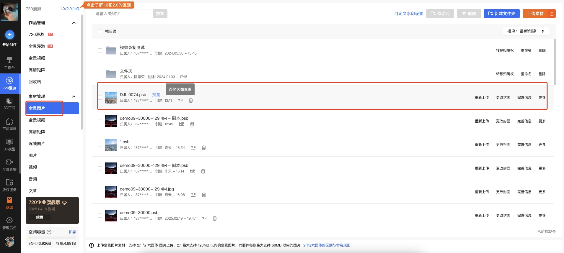 720云网页版-工作台-720漫游-素材管理-全景图片-管理大像素素材