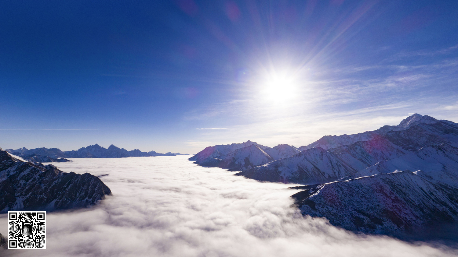 太阳高悬于天空中,散发着明亮的光芒,与雪山和云海构成一方净土,让人相信雪宝顶冥冥中有一股神奇的力量。