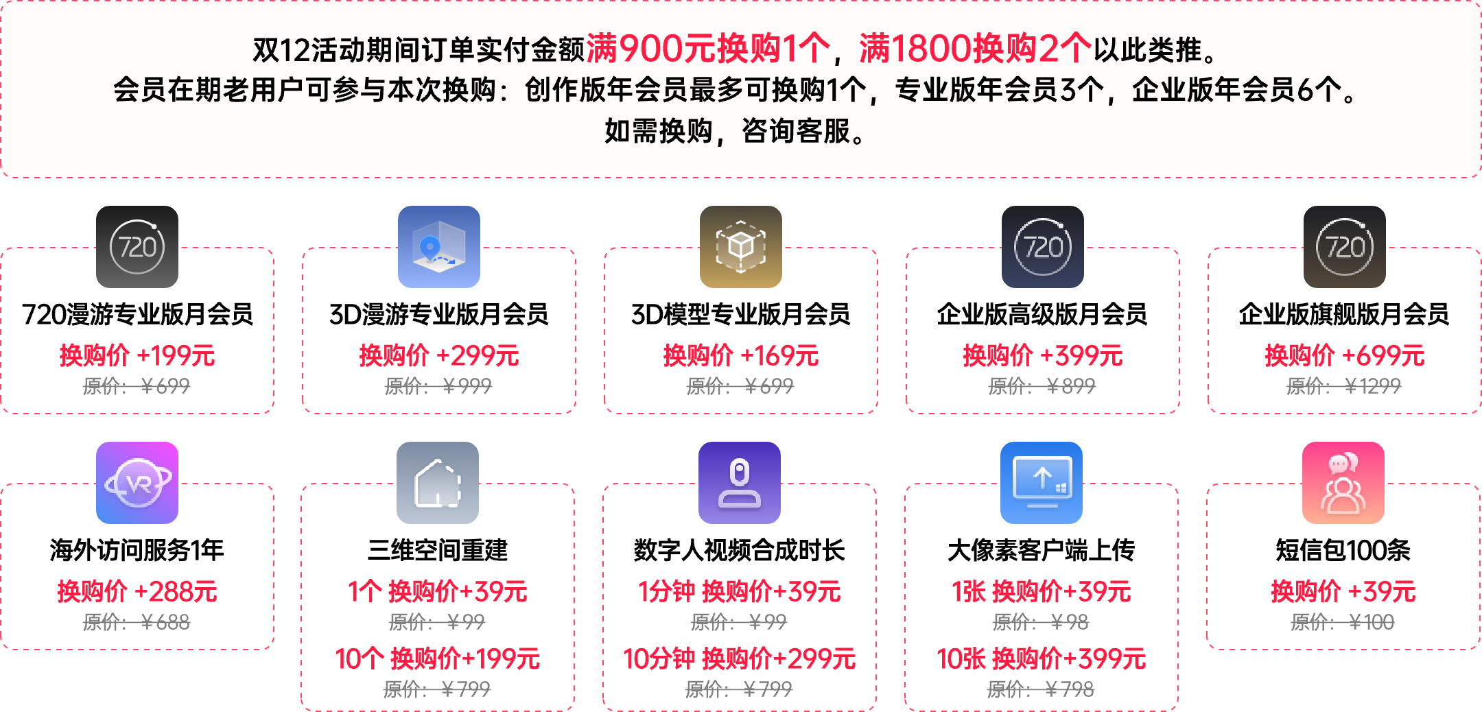 ③ 提供9个产品供用户自由换购,同一个产品可重复换购。如:您的专业版年会员还未到期,选择换购2个720漫游专业版月会员+1个海外访问服务(1年),只需再付686元。