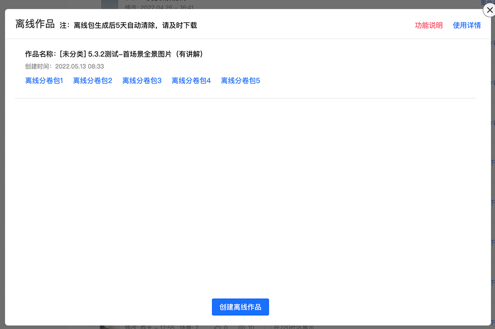 在“用户工作台 ⇒ 720漫游”中,找到需要导出离线包的作品,点击“离线下载 ⇒ 创建离线包” 即可生成作品离线数据包;如作品较大,会生成多个分卷压缩,全部下载完成到本地后,解压缩总压缩包。