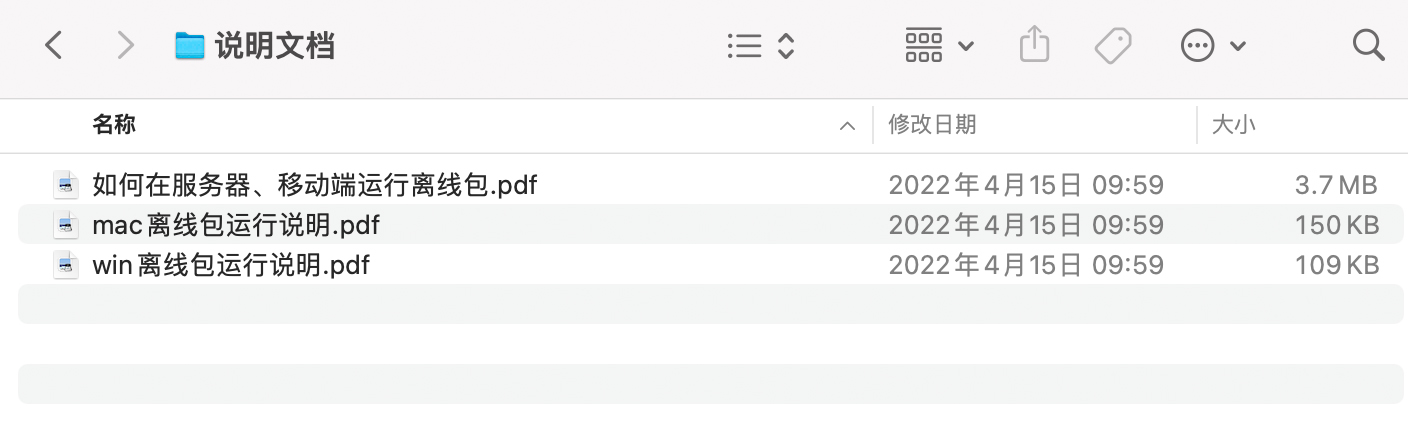 1. 说明文档:里面包含3个pdf教程文件如下,用户可以先阅读了解离线数据包在服务器、移动端,mac端本地,window端本地的具体使用方法。