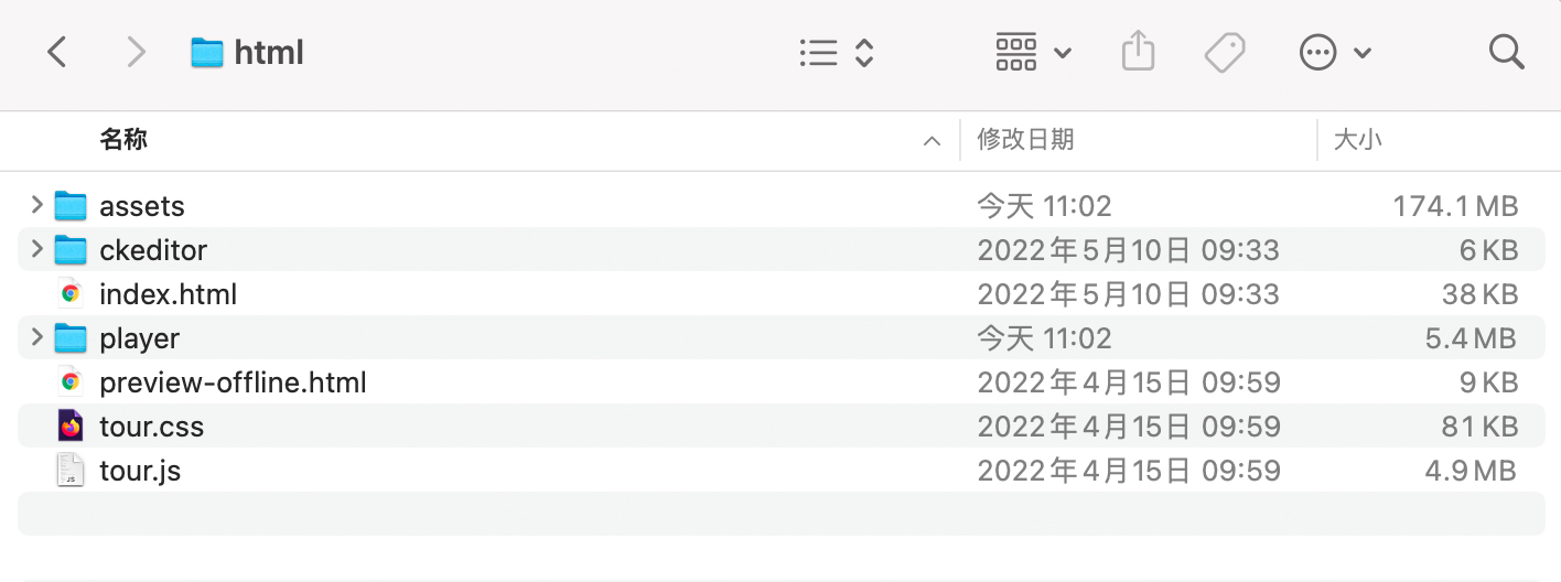 2. html文件夹:720漫游H5文件包,将html文件夹上传至自己的服务器,访问地址指向html文件夹中的“index.html”即可。