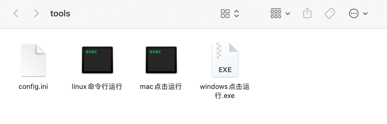3. tools压缩文件:把tools文件解压,得到如下4个文件,鼠标双击“linux命令行运行/mac点击运行/windows点击运行”,可以分别在linux环境/mac OS系统/windows系统下自动打开浏览器调用html中文件进行本地离线漫游作品查看。