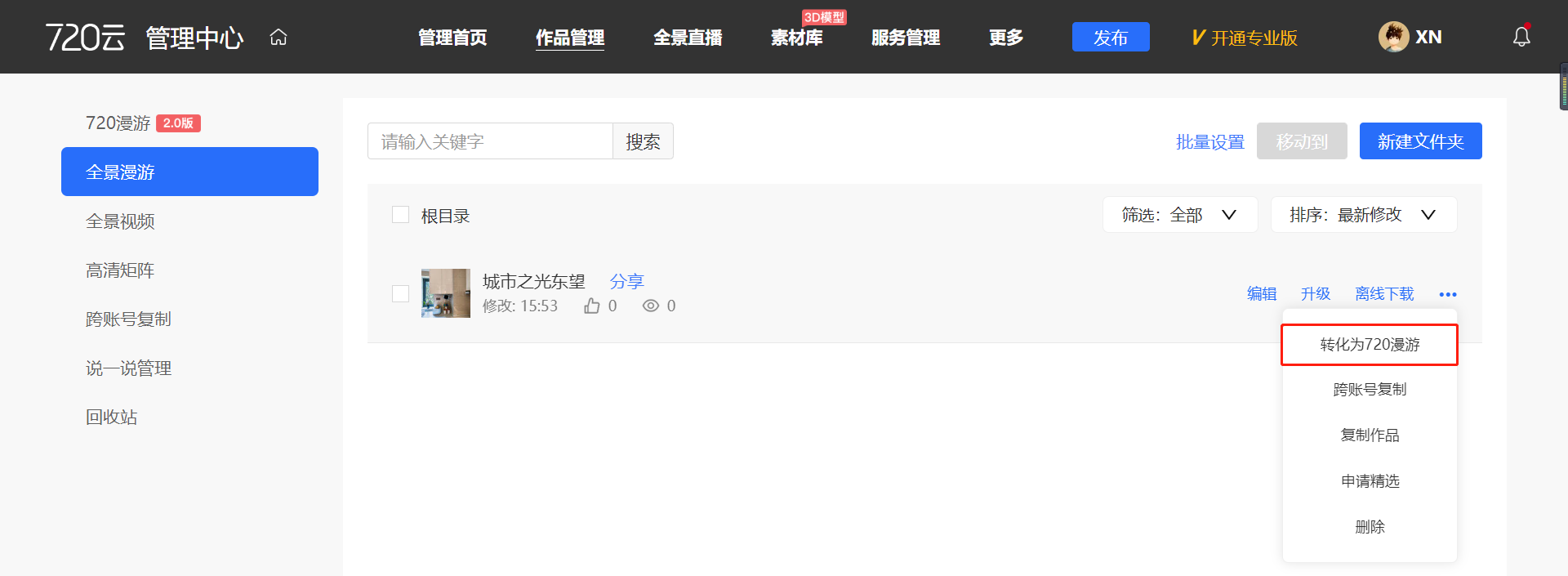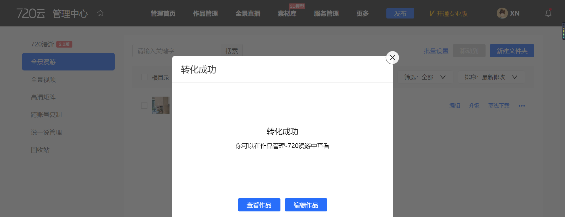 进入作品管理,找到对应作品,点击“…”,弹出选项框,点击第一个“转化为720漫游”。