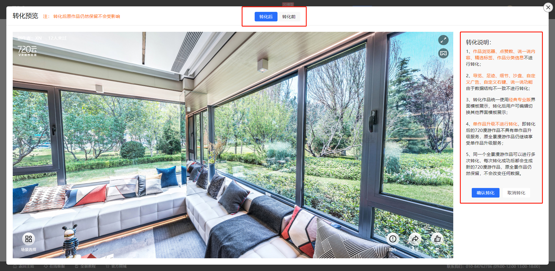弹出转化预览,可点击切换查看“转化后”和“转化前”效果对比,如确认没有问题,可点击“确认转化”。