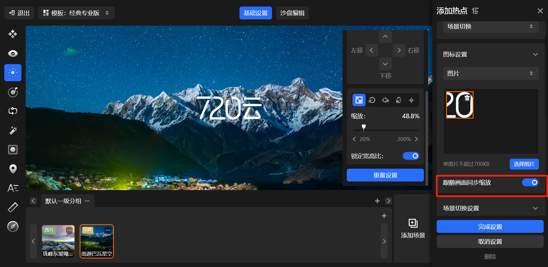 高清矩阵场景设置热点图标时,支持设置“跟随画面同步缩放”,以达到“嵌入”画面效果。