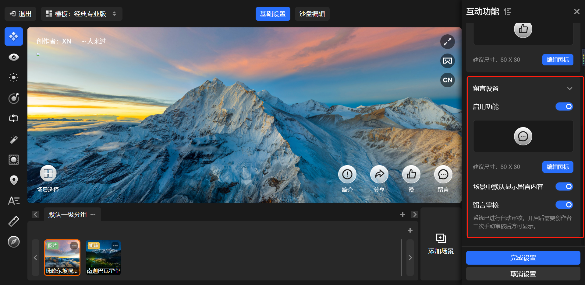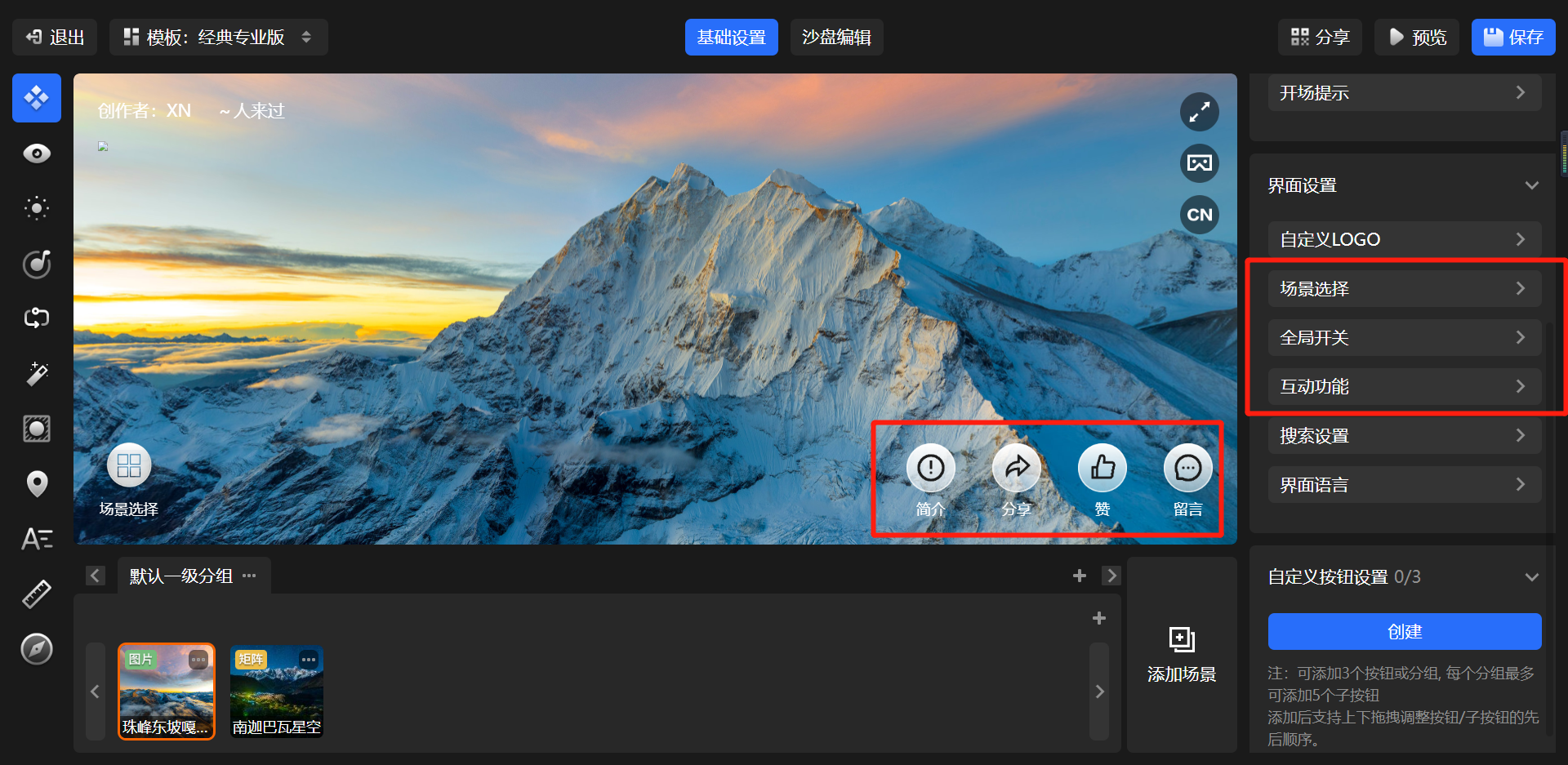 在经典免费版/经典专业版模板下,简介/分享/点赞/留言按钮图标支持选择系统预设或自定义上传图标配置显示。