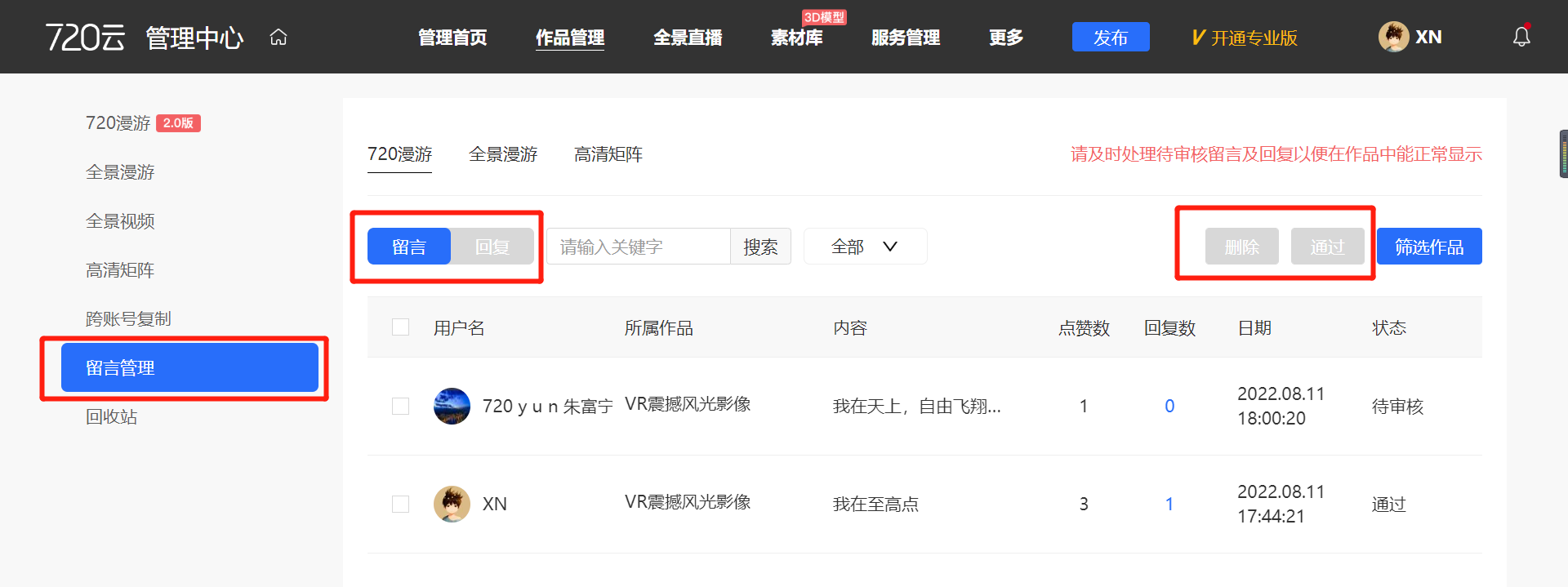 此外,创作者进入“管理后台-作品管理-留言管理”可集中对留言及回复 进行审核(系统自带审核功能,如用户还需要自己审核才能展示,可以进行设置)、删除操作。