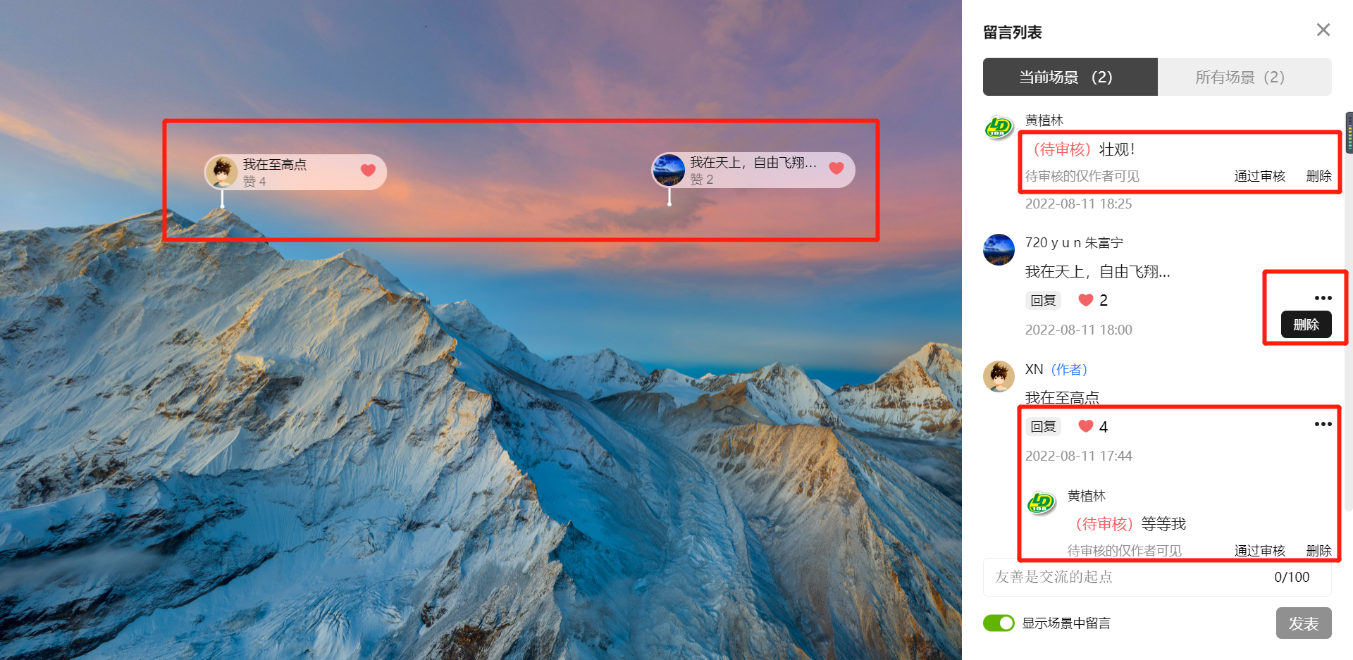 4、场景内留言数量无限制,留言列表中显示全部内容,单个场景中显示数量只有30条,但内容可随滚动留言列表,同步更换显示。