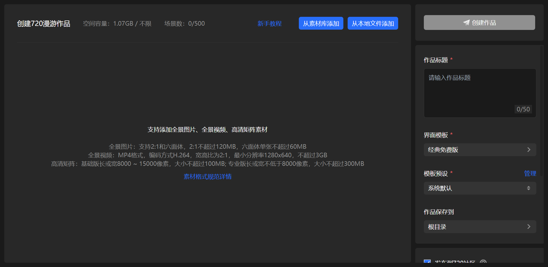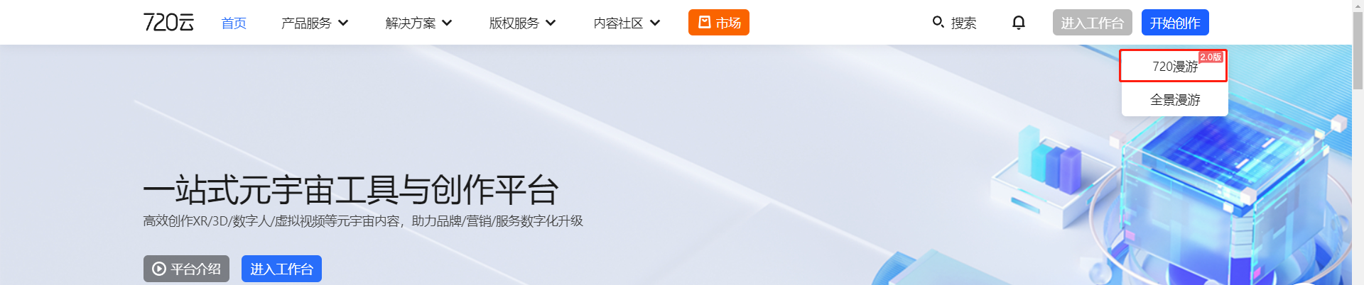 点击“开始创作”-“720漫游”进入720漫游作品发布页面。
