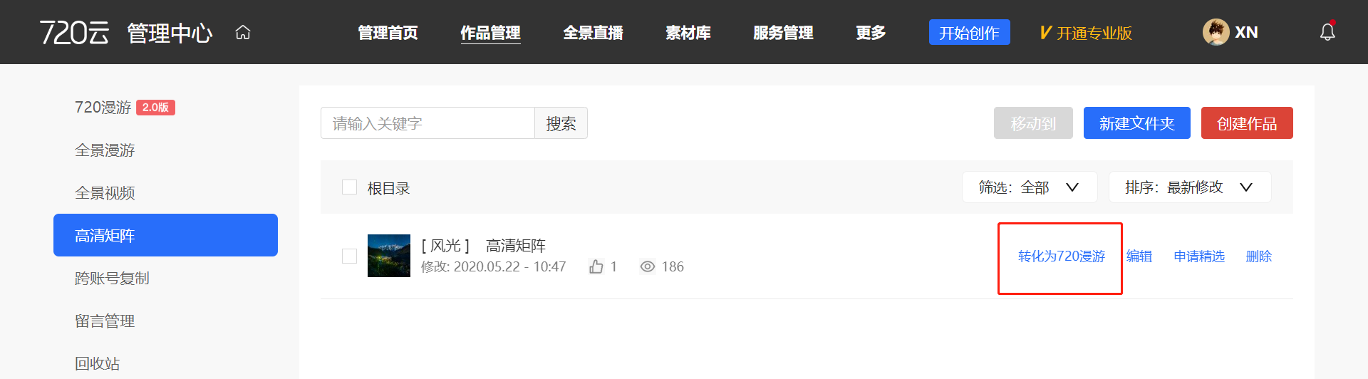 进入作品管理,找到对应作品,点击第一个“转化为720漫游”。