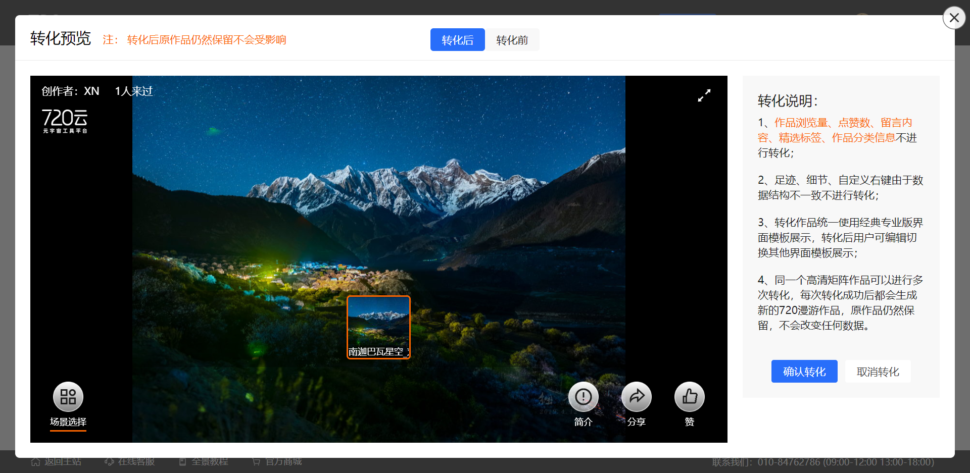 2、同一个1.0作品可以进行多次转化,每次转化成功后都会生成新的720漫游作品链接