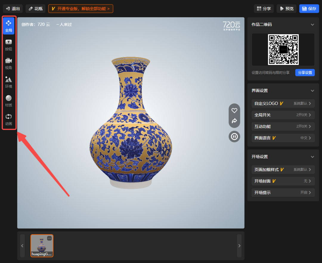 目前该产品第一个版本已上线6大功能模块:包括“全局/按钮/视角/环境/材质/动画”的编辑设置,未来将会有更多的新功能加入其中,让您的3D模型编辑更加高效便利。