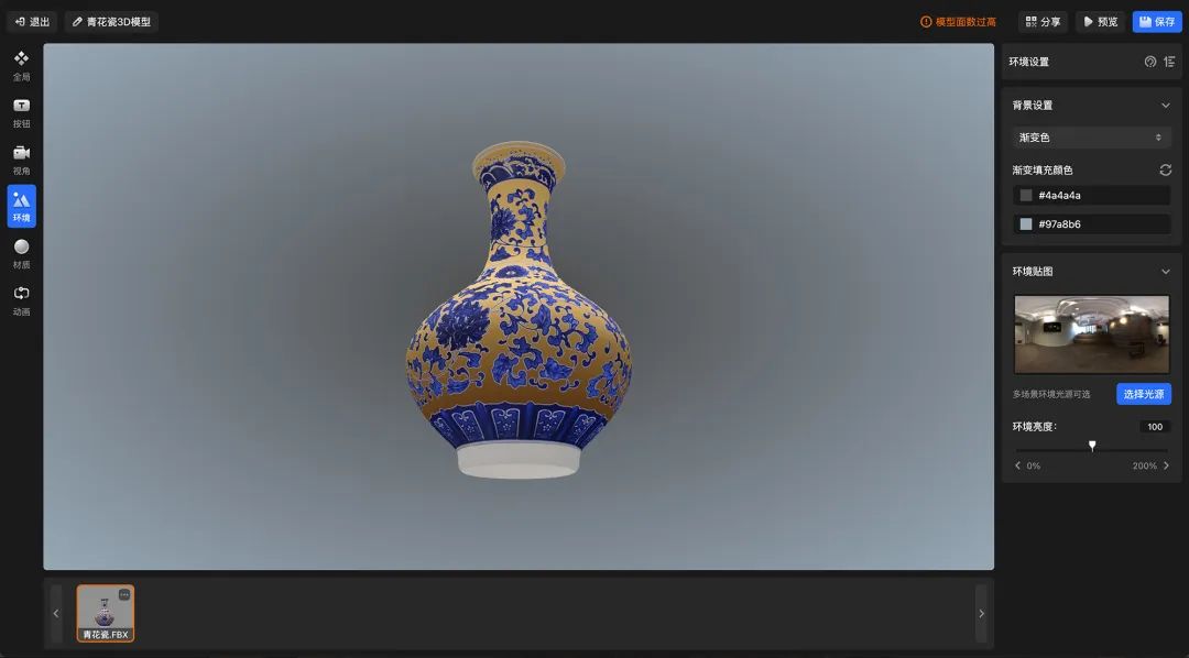 环境设置支持调整作品调整整体的背景颜色,或针对模型调整环境光源以此改变模型的材质反射效果,让3D模型展示更有“灵性”和“真实感”。仿佛1:1的实物展示,帮助您更好的展示模型的细节。
