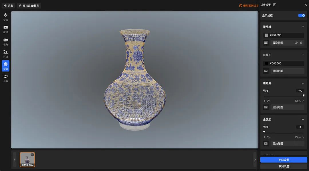 材质的设置支持对模型调整漫反射,自发光,粗糙度,金属度,法线贴图,等材质信息,以增强模型质感的表现增强模型的质感。