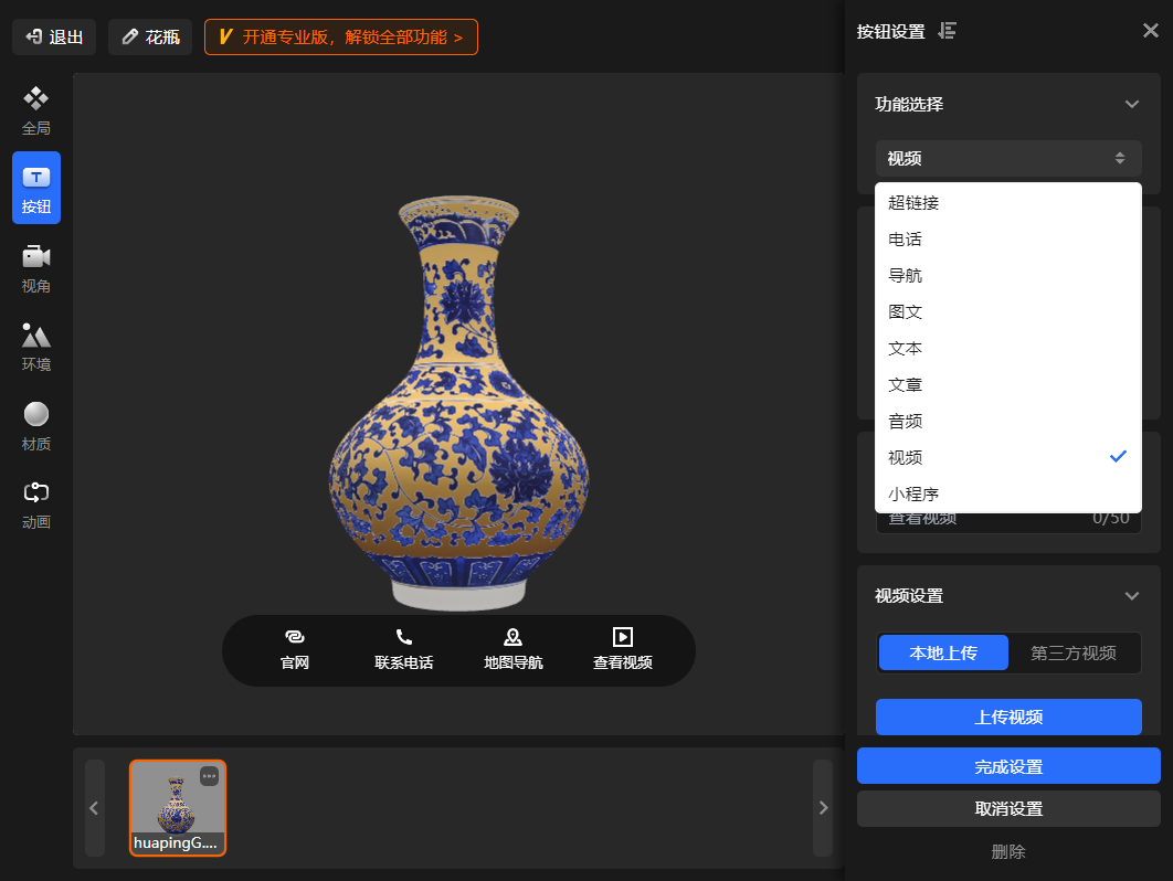720云的3D模型工具支持设置多种常用偏营销转化类功能菜单按钮,让不同行业可以打造出更具行业应用特色的模型案例,充分体现模型价值。支持添加超链接、电话、导航、图文、文本、文章、音频、视频、小程序,共9种互动按钮。可灵活运用功能菜单按钮添加官网地址、联系方式、图文介绍和文章等。