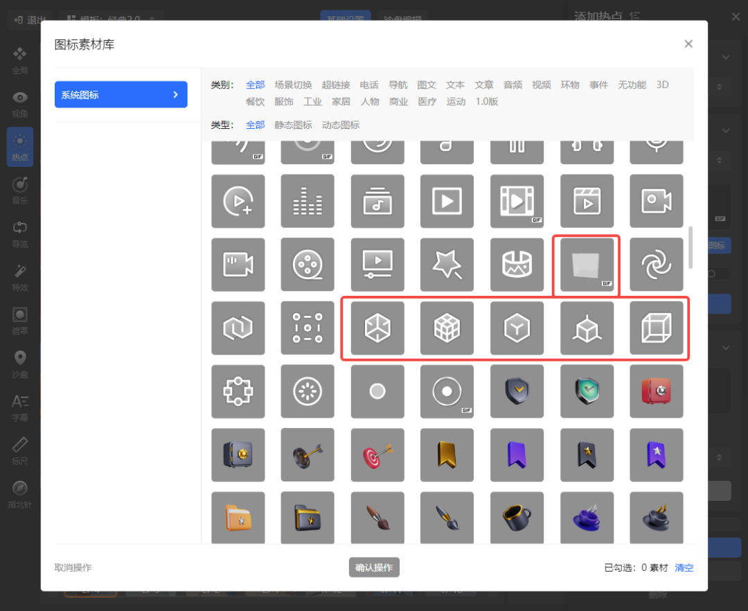 720云3D模型互动工具可以通过720漫游内的热点打开,热点图标可以采用720云系统图标中具有3D特性的几款,为展厅内做过3D模型展示的展品进行细致的热点标记。