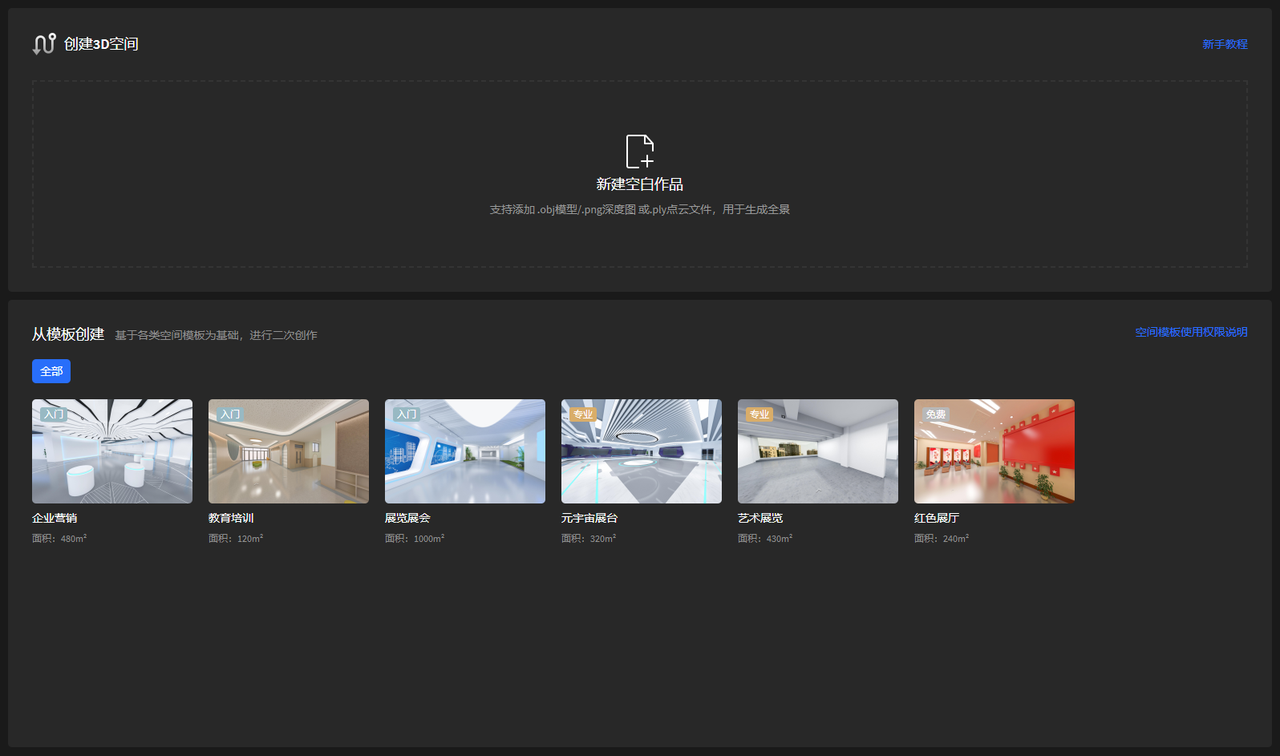 创建3D空间作品:您可以选择新建空白作品或使用720云提供的预设空间模板,以下分别介绍两种方式制作3D空间漫游作品