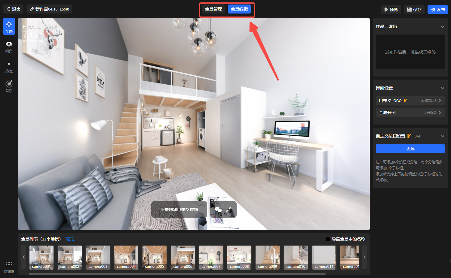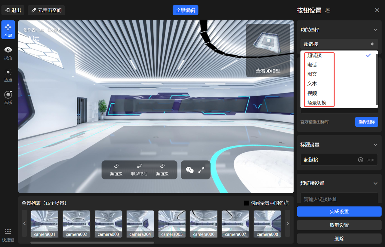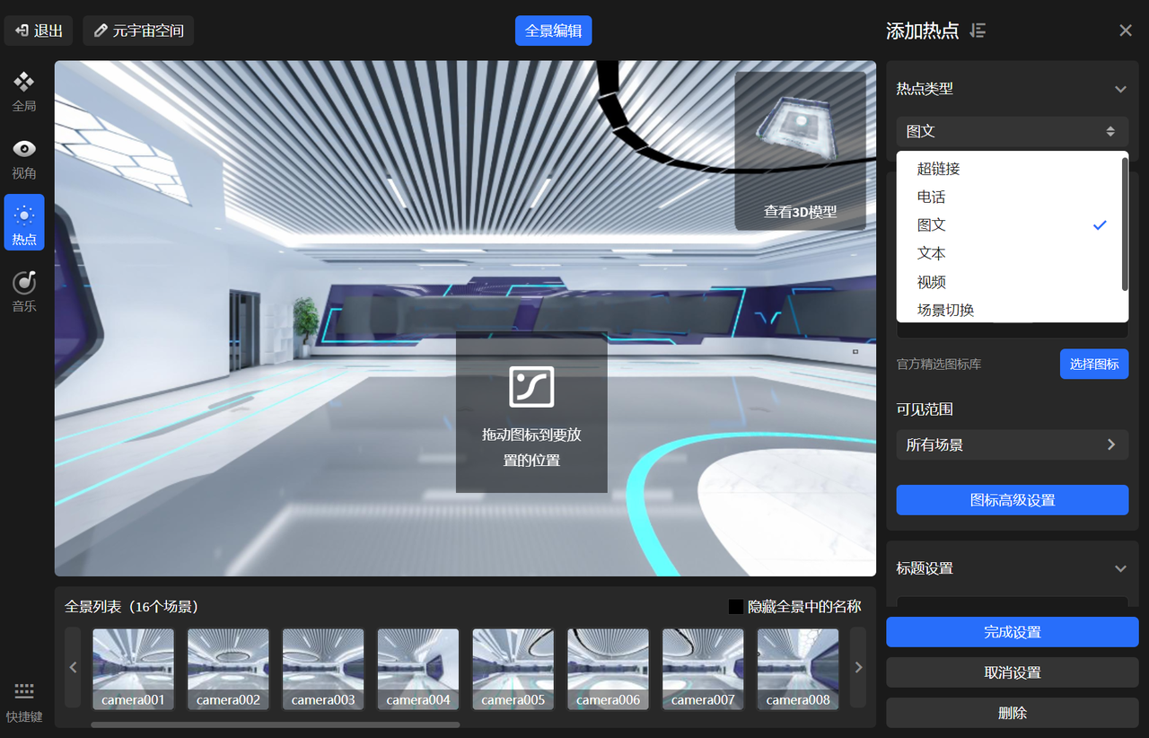 5.模型生成后,可以给予已生成的模型继续在“全景编辑”中进行其他功能的完善。3D空间漫游目前支持“全局设置、视角设置、热点设置、音乐设置”四大功能模块。