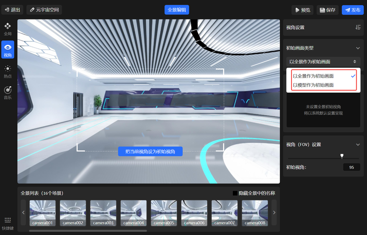 2. 视角设置:可为全景空间设置一个视角作为首次打开作品时的初始画面,支持将初始画面设置为“全景或模型作为初始画面”