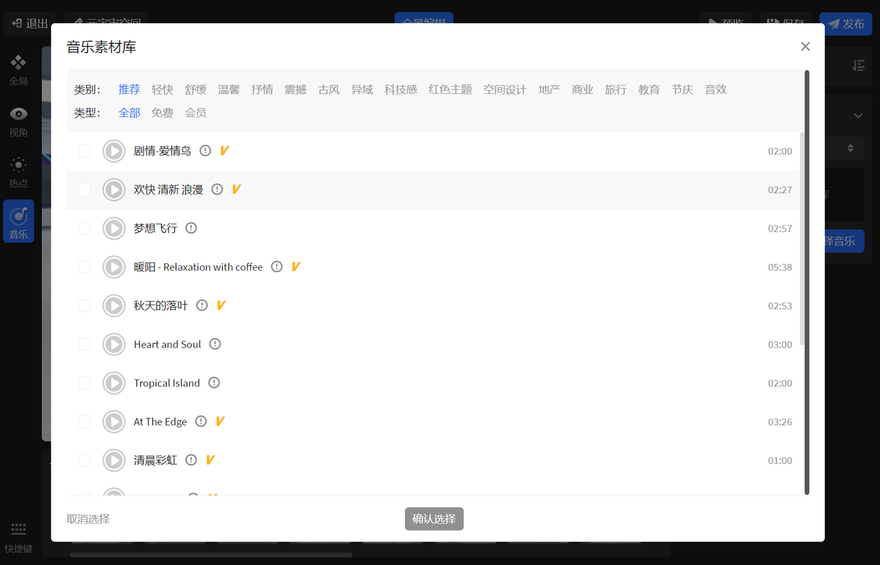3D空间漫游支持背景音乐设置,用户可以选择自定义音乐上传或选用720云官方正版音乐库的音乐,不必担心版权纠纷的风险同时也省去了找不到合适音乐的烦恼