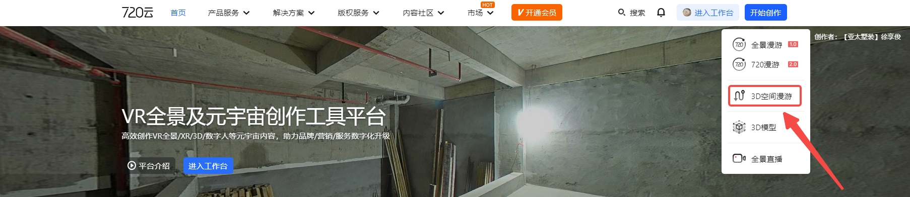 进入720云官网-点击“开始创作”-选择3D空间漫游-进入到作品创建页面