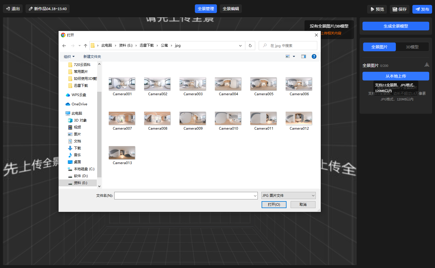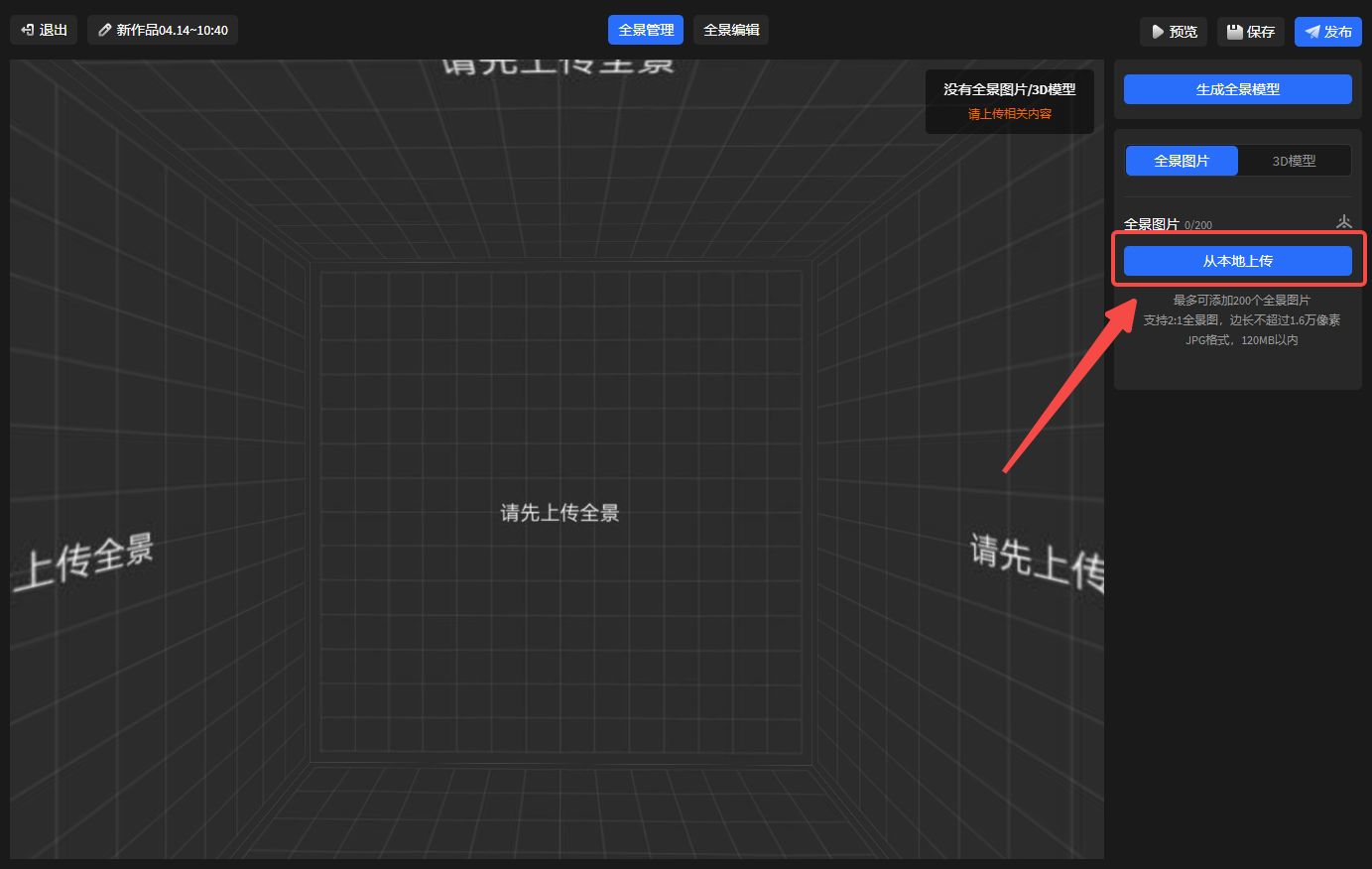 1. 空白作品需要先上传全景图片生成全景模型,点击右侧的从本地上传。最多可添加200张全景图,支持2:1全景图,边长不超过1.6万像素。JPG格式,120MB以内。详细素材格式要求请看下表: