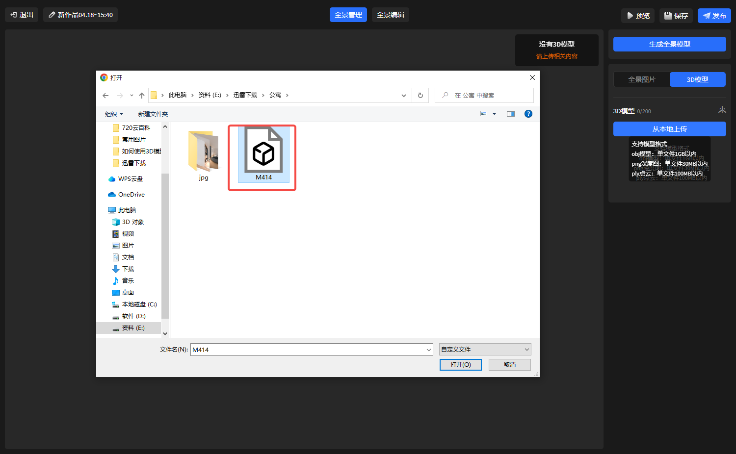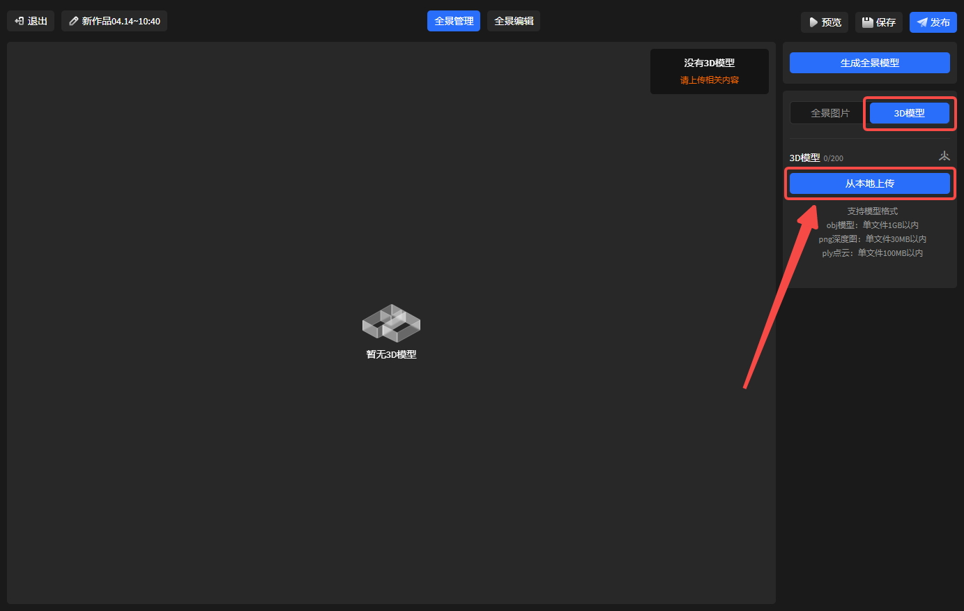2. 上传3D模型。点击“3D模型”-从本地上传。以下演示使用OBJ模型和PNG深度图上传示例,ply点云文件需要使用激光扫描仪扫描获取