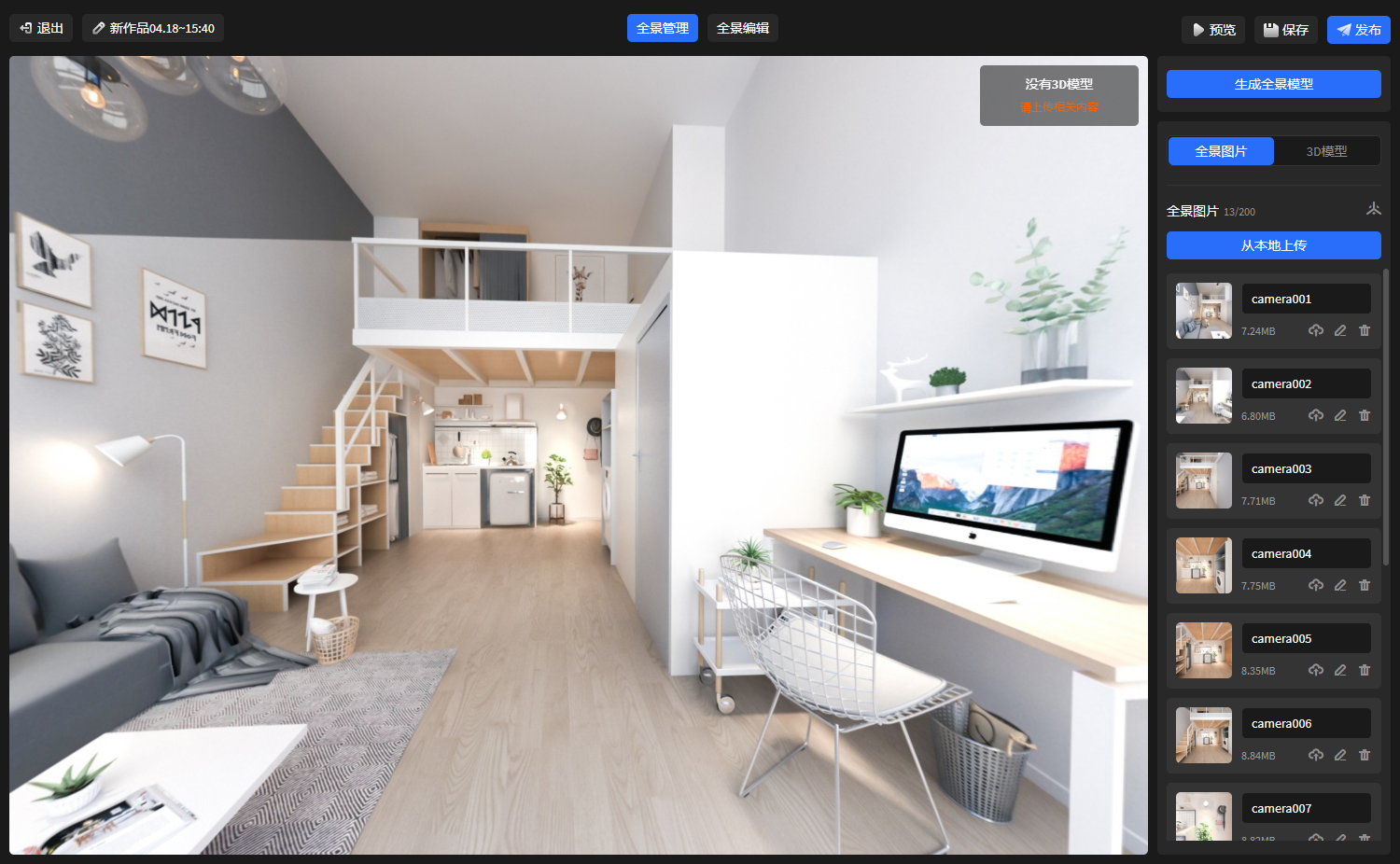 方式一:新建空白作品,上传本地全景图片和3D模型素材