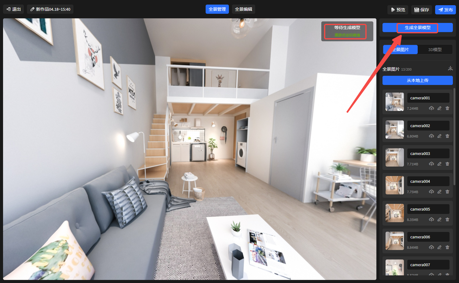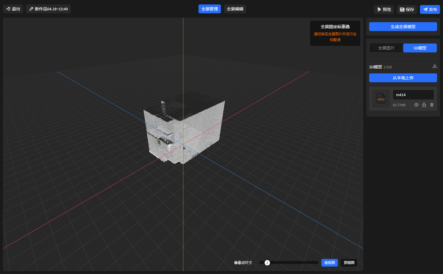 4. 生成模型。坐标文件配准完成后,点击生成全景模型,就可以得到3D漫游空间模型