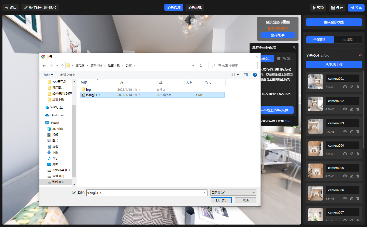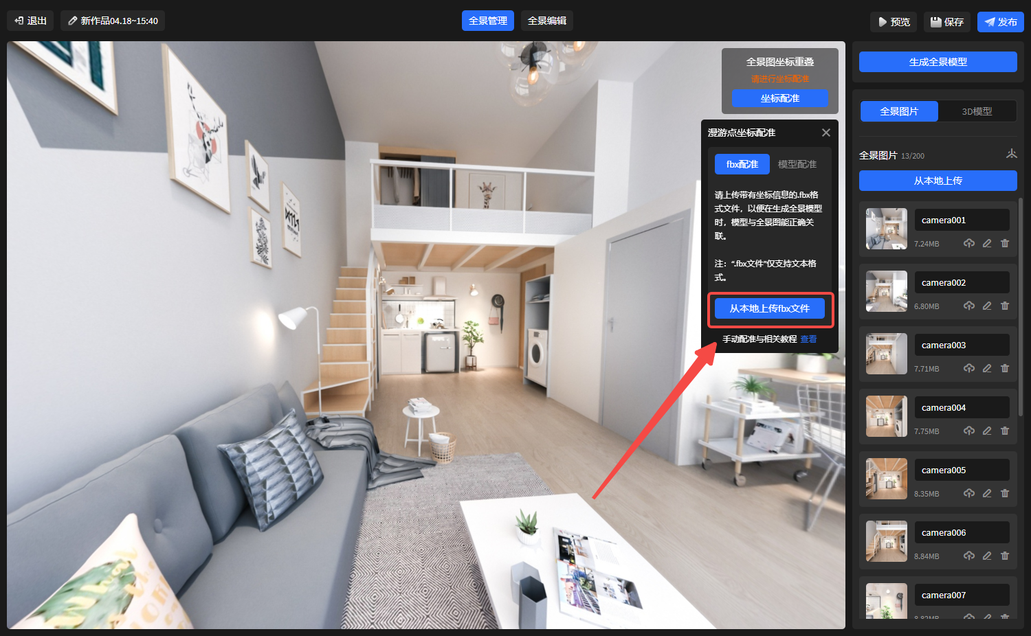 3. 进行坐标配准。坐标配准是指通过上传fbx坐标文件,自动把原本重叠在一起的空间模型或全景图片,按照fbx文件中的坐标值进行有序的排列组合,最终形成一个完整的空间模型。