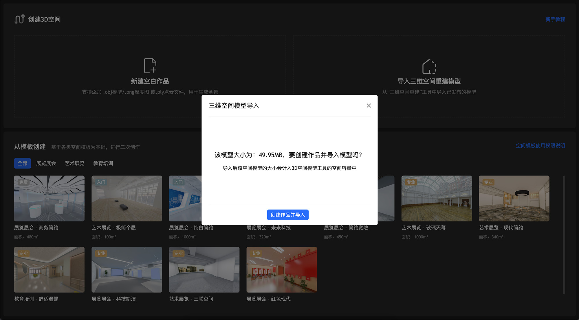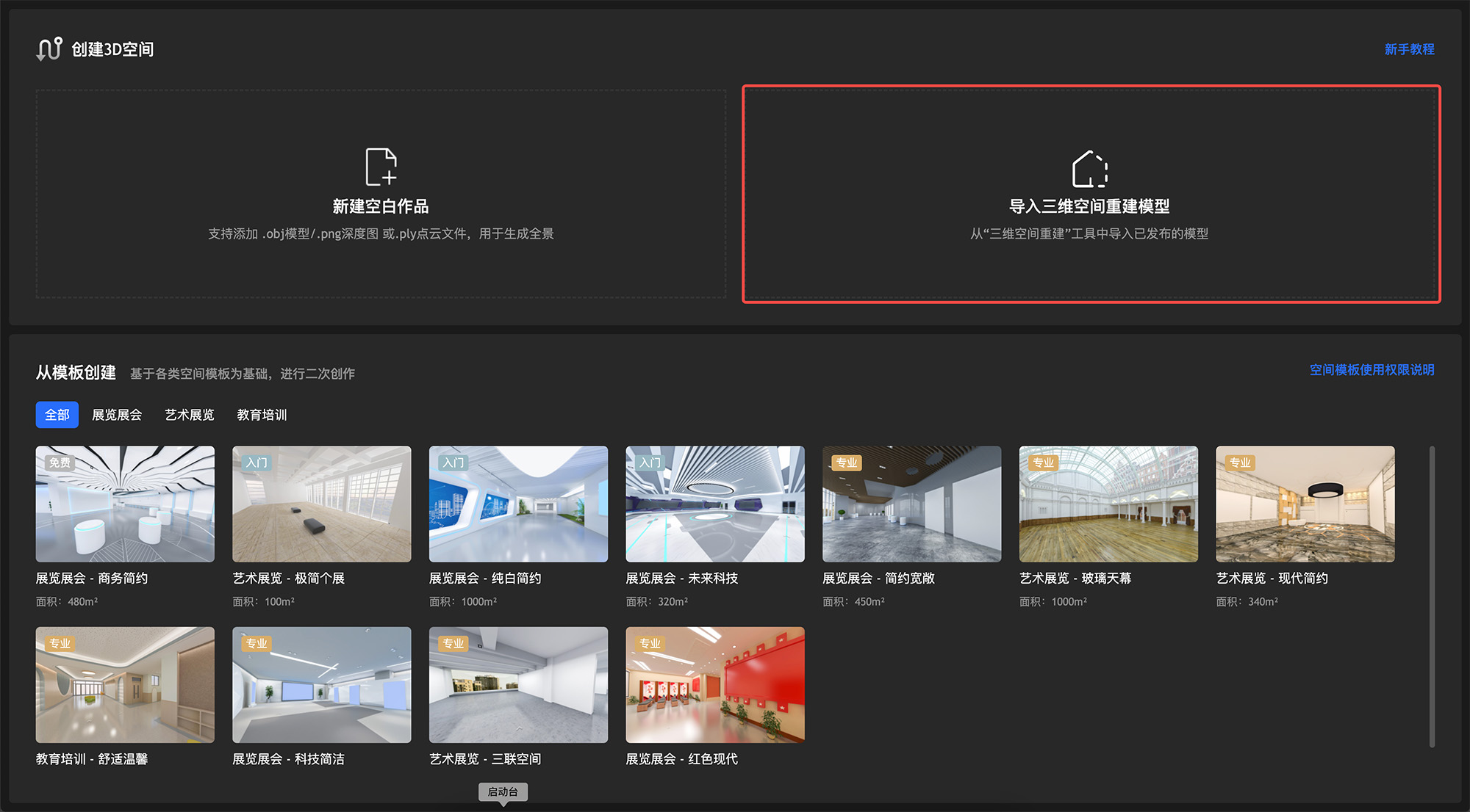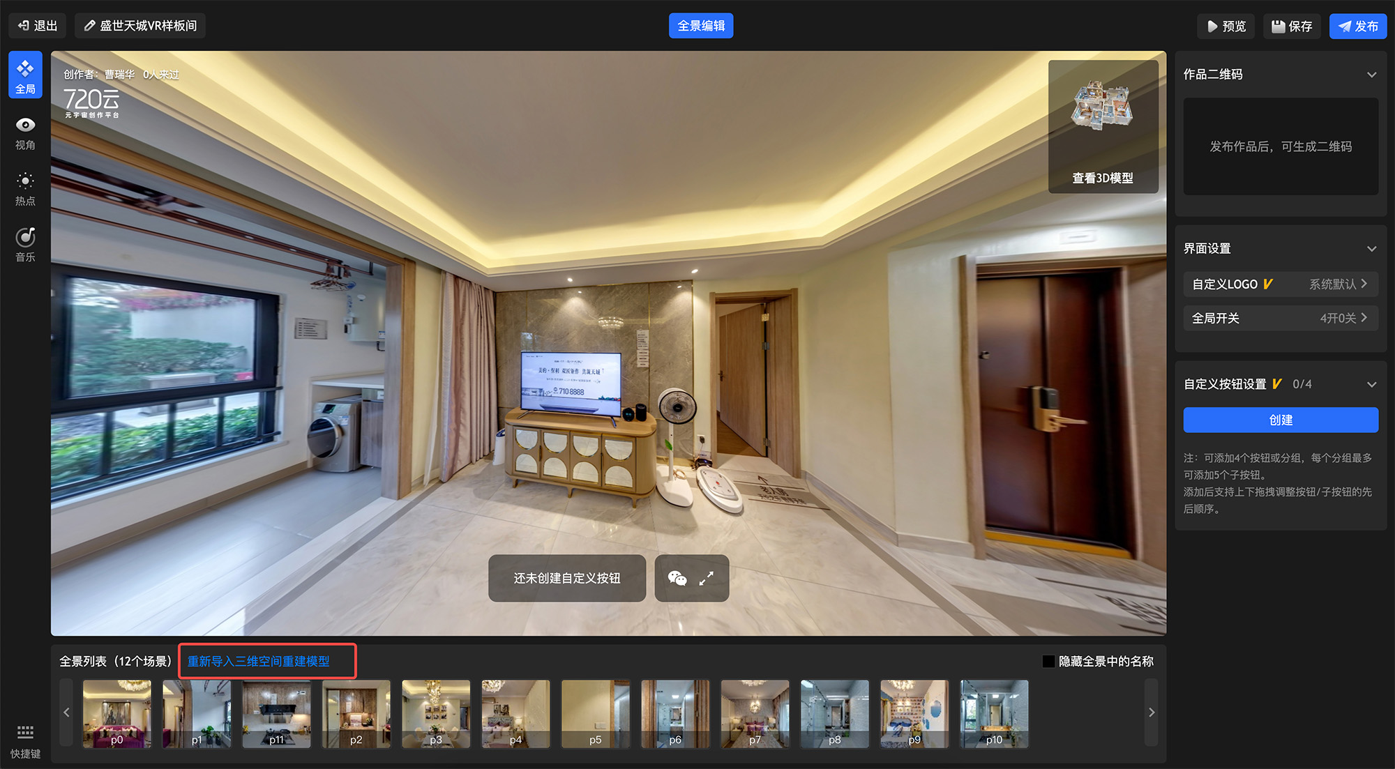 用户进入3D空间漫游作品创建页面,可以通过点击“导入三维空间重建模型”,从已发布的三维空间重建模型中选择模型快速导入3D空间漫游并进行进一步自定义按钮/视角/热点等互动功能制作。