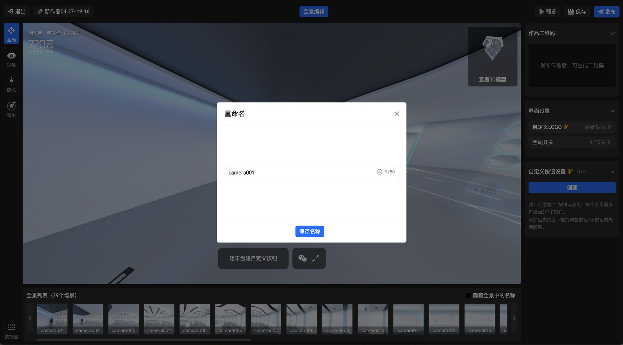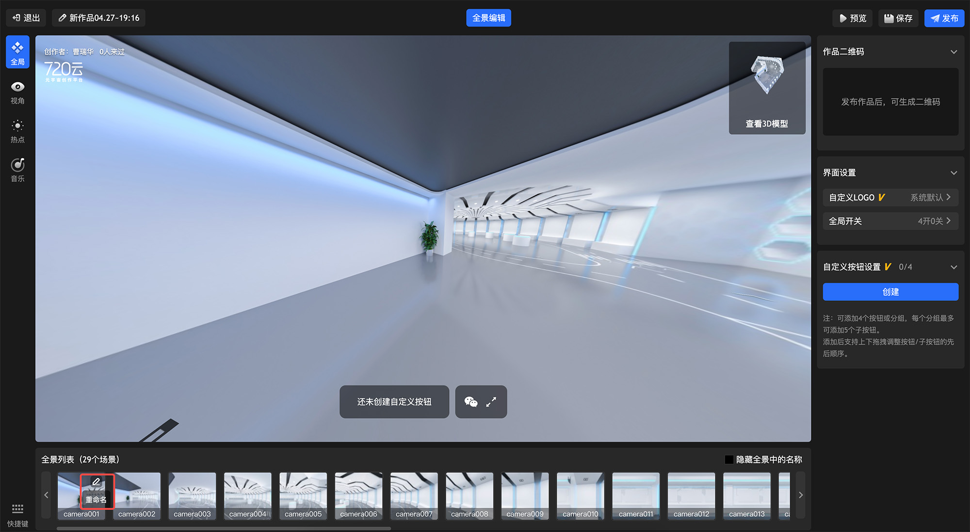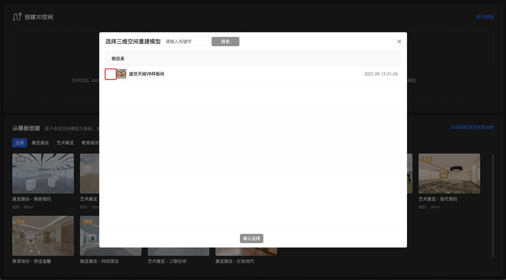 用户进入3D空间漫游作品创建页面,可以通过点击“导入三维空间重建模型”,从已发布的三维空间重建模型中选择模型快速导入3D空间漫游并进行进一步自定义按钮/视角/热点等互动功能制作。