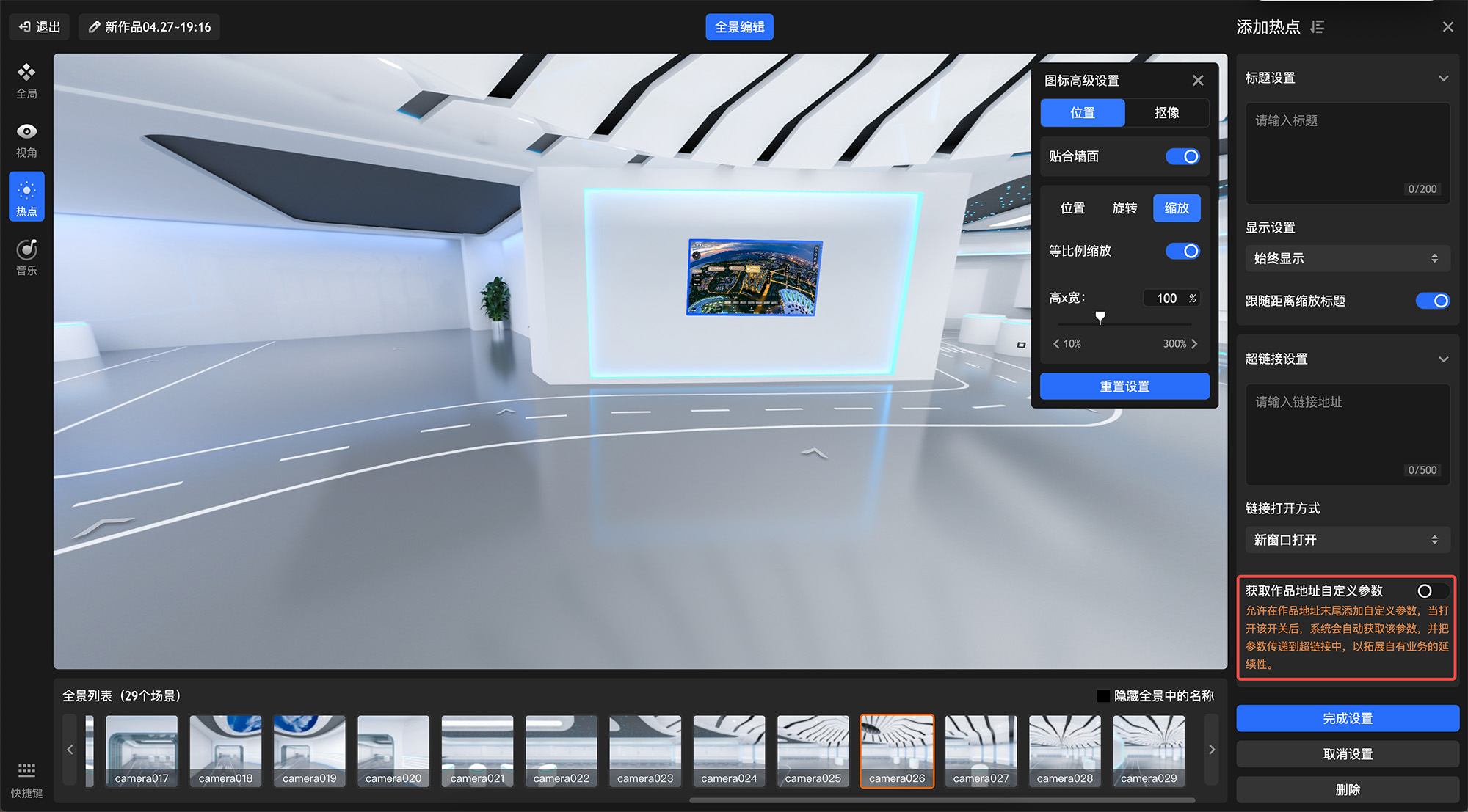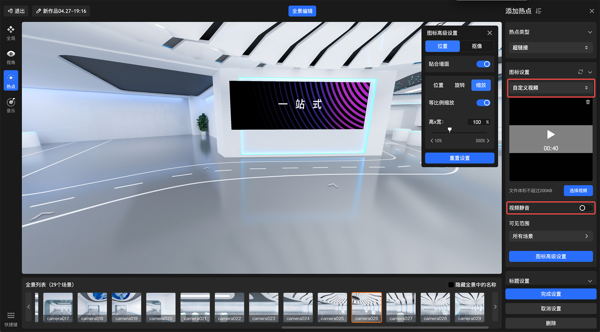 在热点 - 自定义视频热点中,新增“视频静音”开关,默认关闭状态。 当空间中添加了多个视频时,远距离的视频会自动静音。