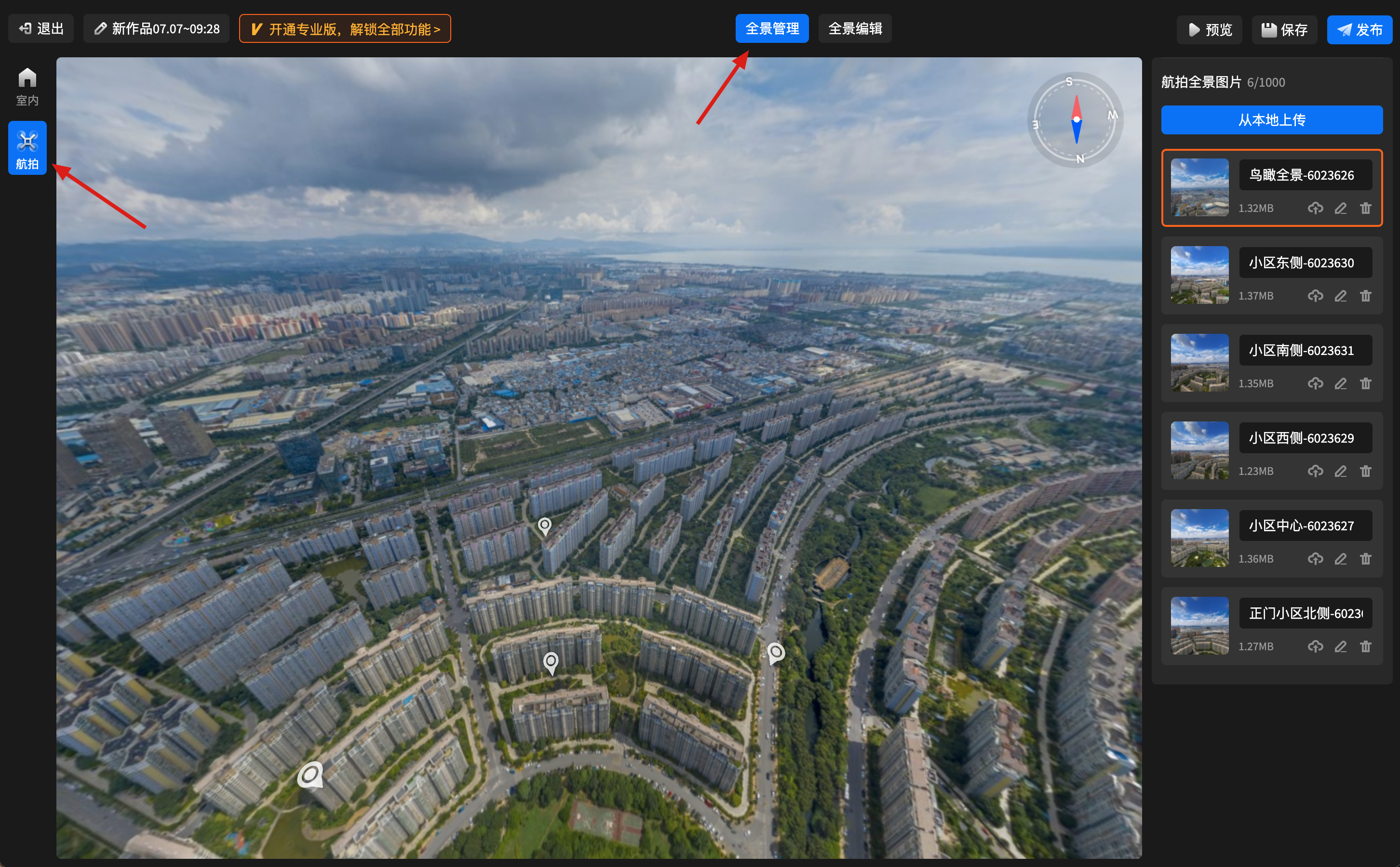 a. 在进行航拍过程中,每一个全景点位的初始画面都需要保证是同一个方向,建议都朝向正北方向进行拍摄。以避免上传到平台后,在行走漫游过程中各个点位方向错乱的问题。(如果方向不对,可通过“编辑”该航拍重新调整正北方向即可)