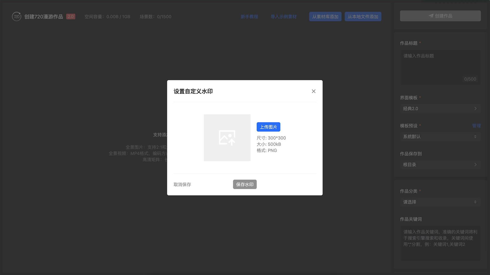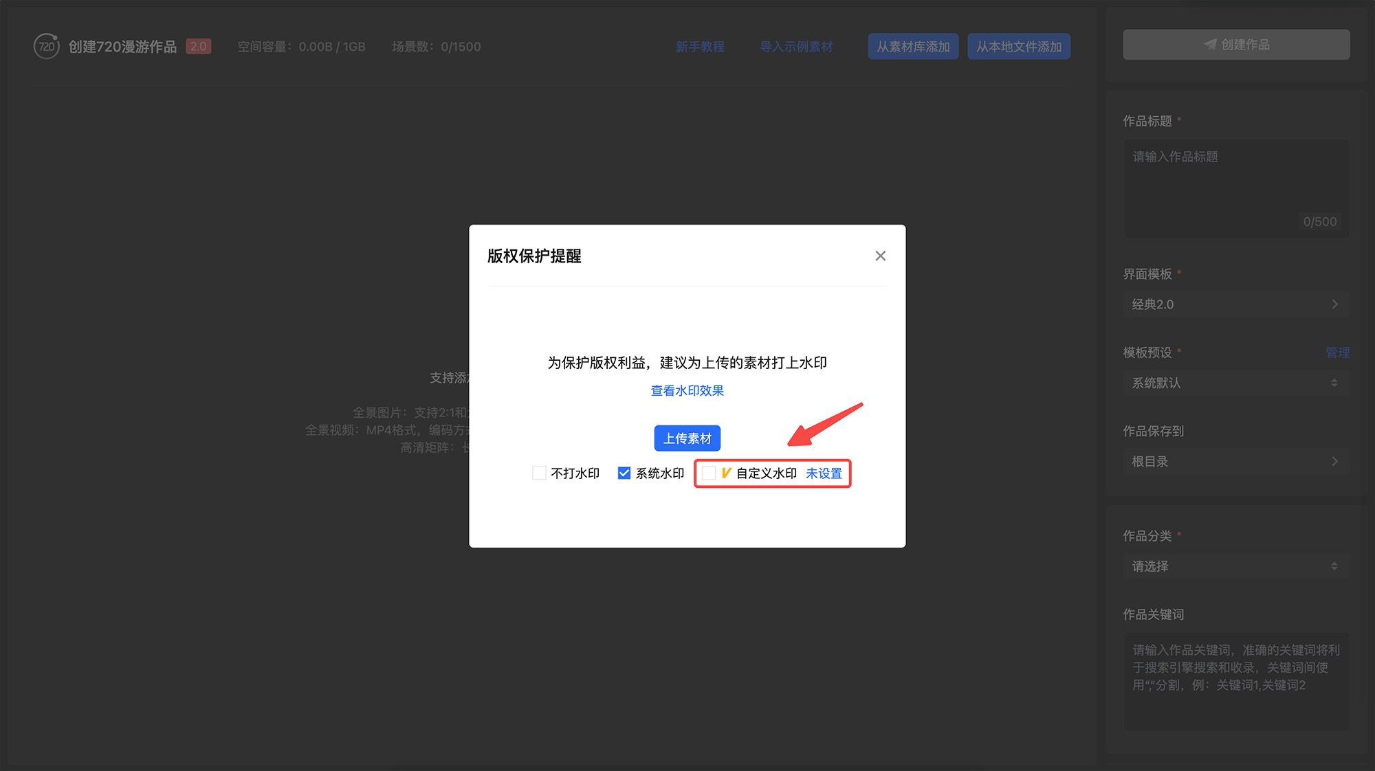 打开「创建720漫游作品页」-选择「从本地文件添加-全景图片」-勾选「自定义水印」- 设置自定义水印 - 返回点击「上传素材」进行素材上传,上传后的素材将打上自己设置的水印。