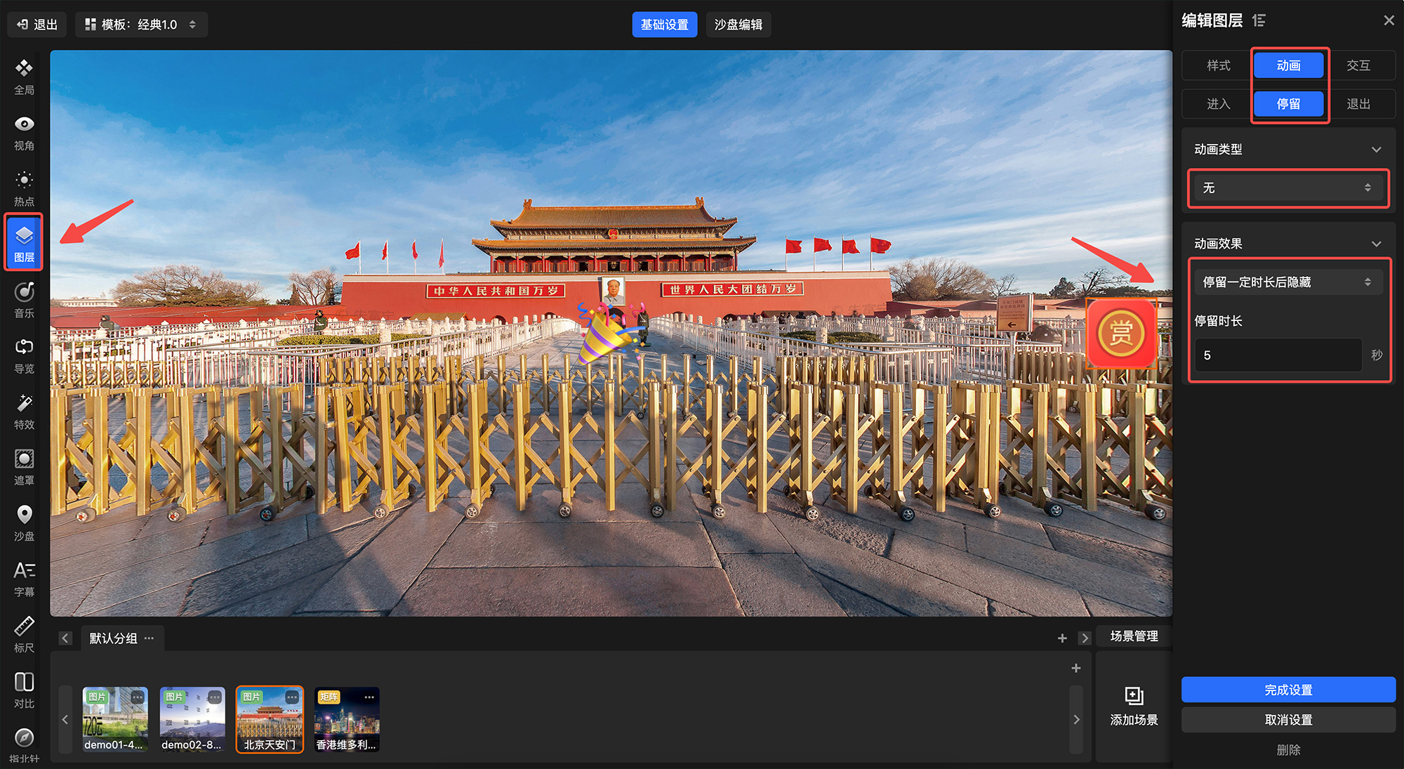 「图层设置」中停留动画=无 时,新增支持设置“停留一定时长后隐藏”,来实现某些图层静止显示一定时间后自动消失的应用场景。