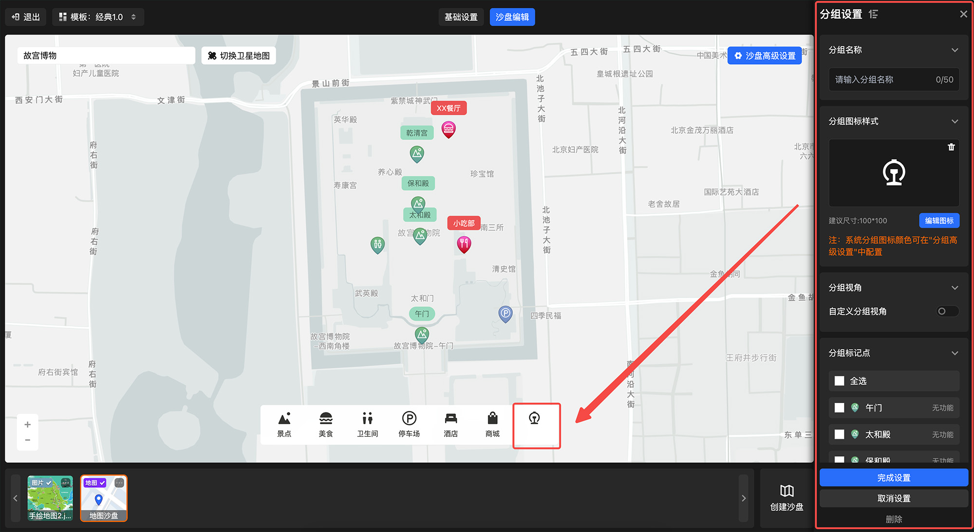 进入「沙盘编辑」,选择对应沙盘 - 点击左上角「标记点分组设置」按钮,进入分组设置栏 - 点击「添加分组」打开分组设置弹窗 - 输入分组名称、选择分组图标、设置分组视角、选择分组下的标记点,完成设置即可完成标记点分组的创建。