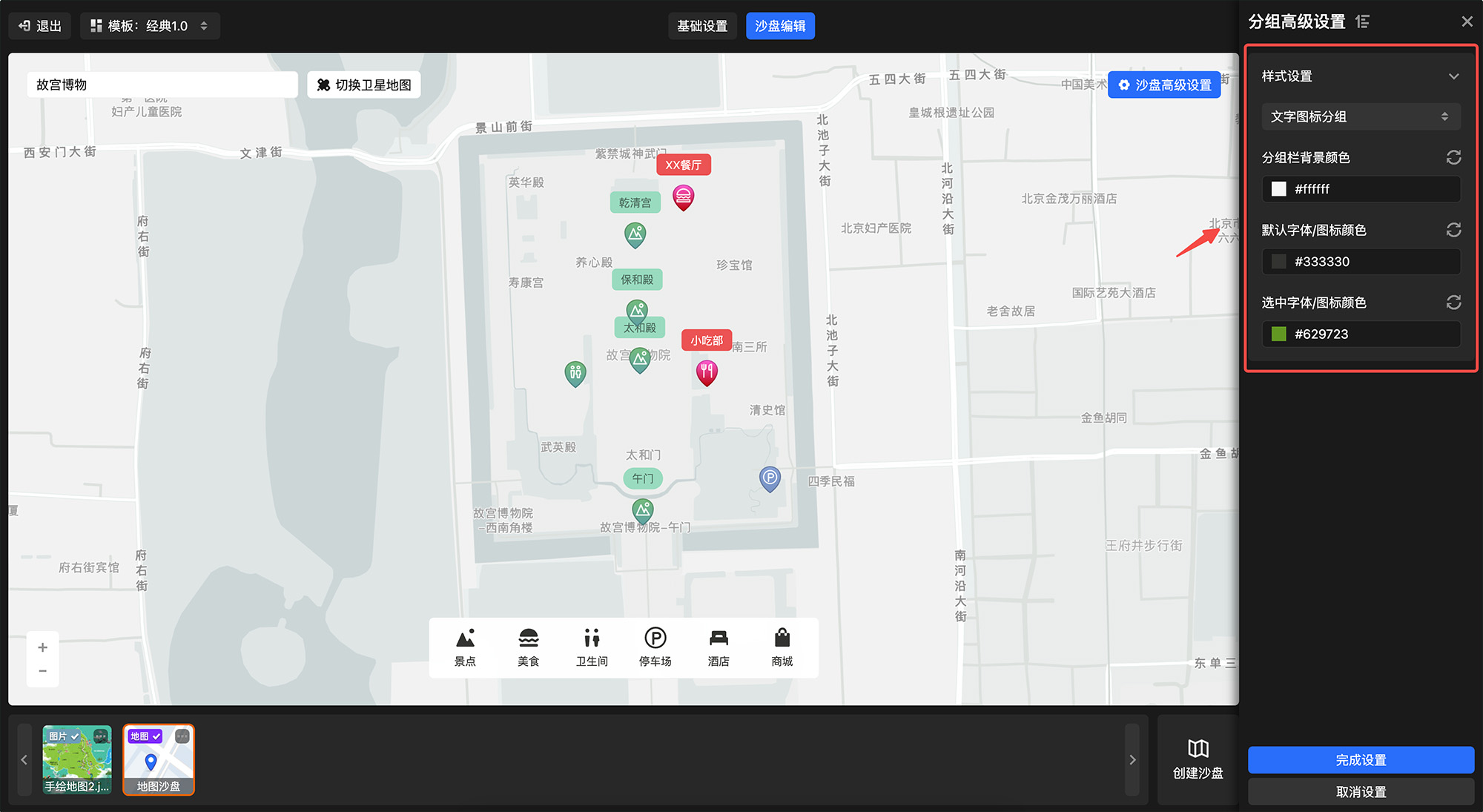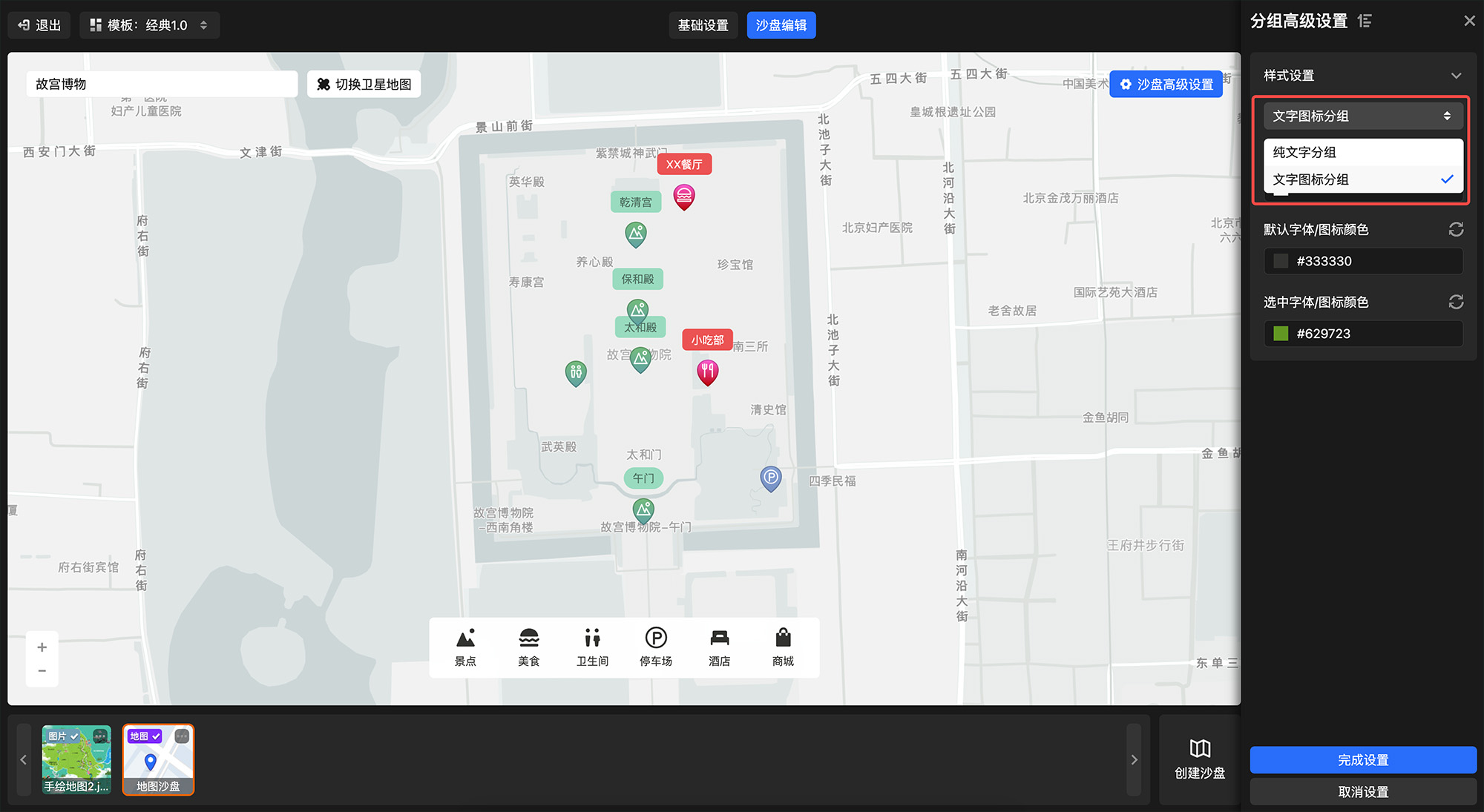 在标记点分组设置栏 - 点击底部「分组高级设置」打开设置弹窗 - 选择分组样式(共有纯文字分组/文字图标分组 2种样式)、设置分组栏背景颜色、默认字体/图标样式、选中字体/图标颜色,完成即可。