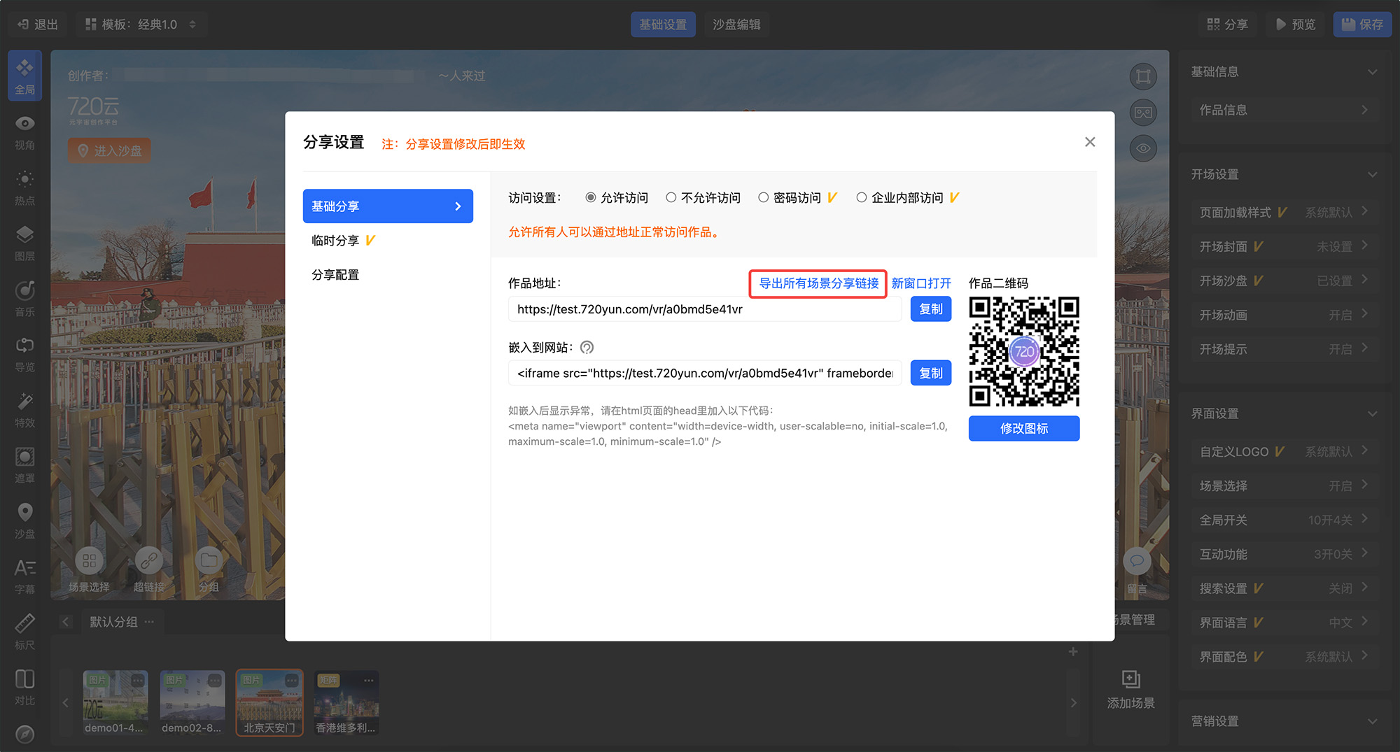 九、720漫游作品分享新增「导出所有场景分享链接」