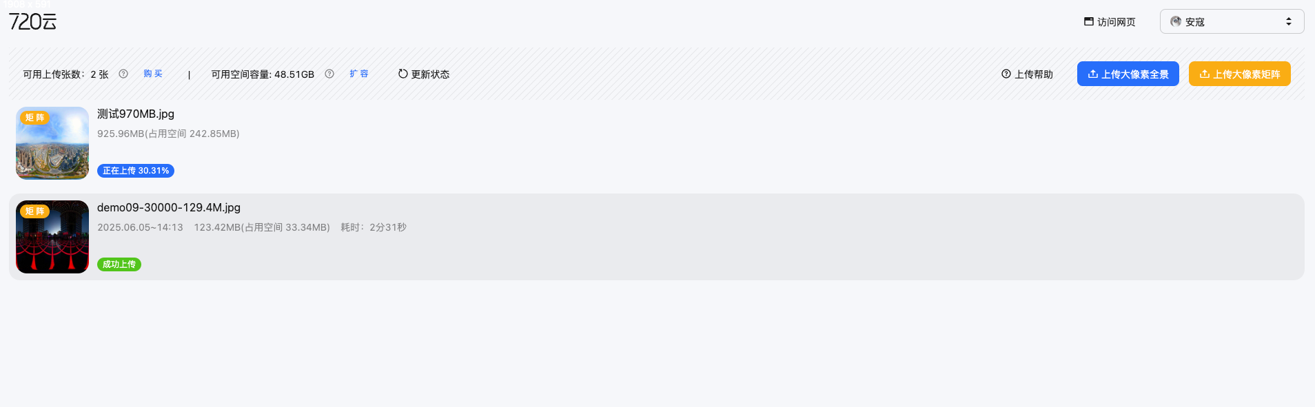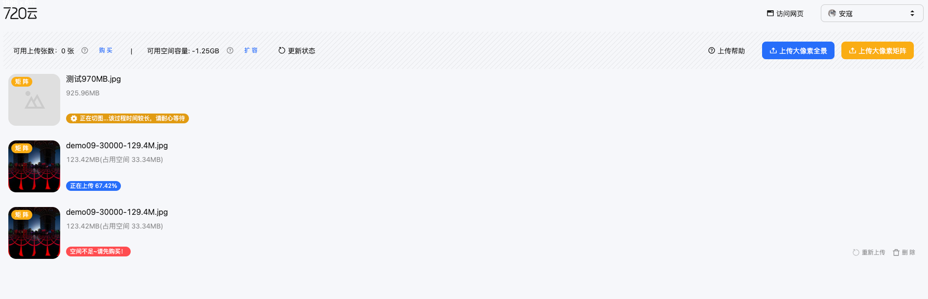 4. 为保证切图上传成功,请确保有足够的上传张数、720 云空间容量以及电脑的磁盘容量。