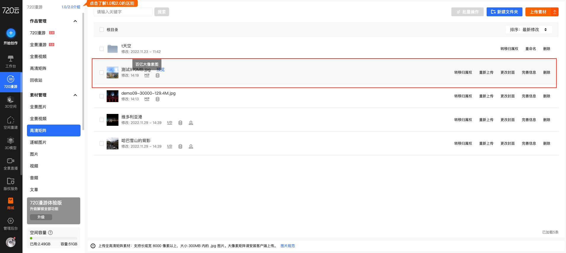 720云网页版-工作台-720漫游-素材管理-高清矩阵-管理大像素素材