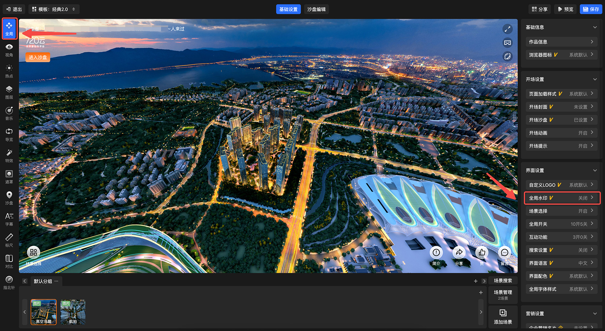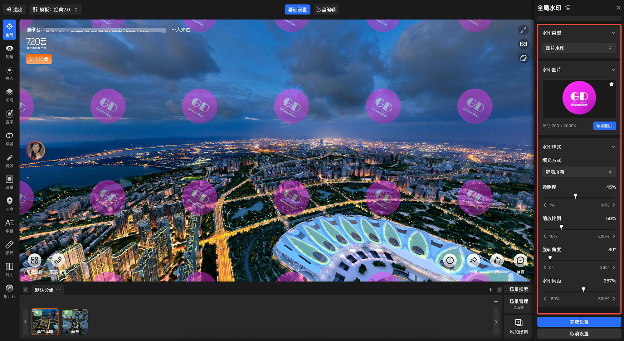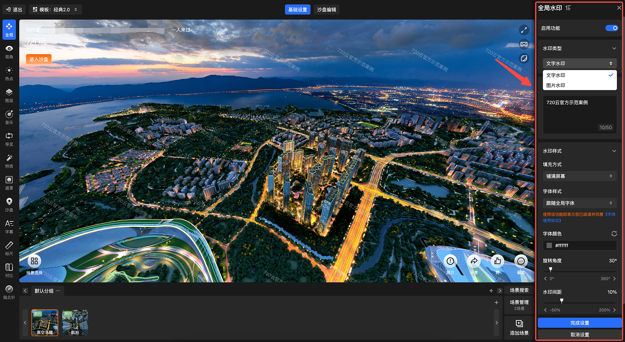 720漫游【全局设置-界面设置】功能栏新增【全局水印】功能,点击进入功能设置栏,开启功能后可以进行水印的具体设置,支持选择文字水印和图片水印两种水印形式。