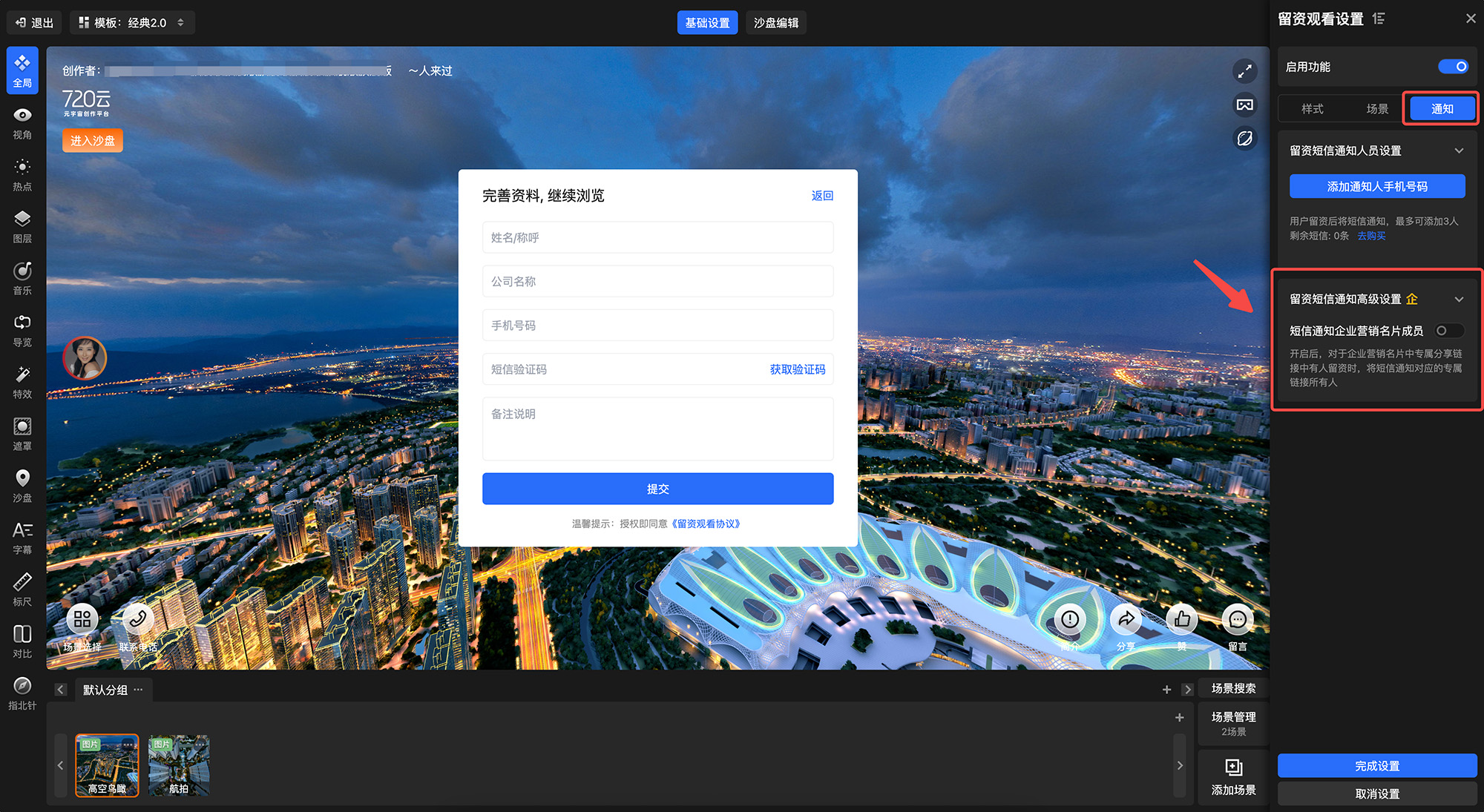 720漫游【全局设置-留资观看设置】中在“通知”设置栏中新增“短信通知企业营销名片成员”功能开关,开启后,当用户在企业成员专属分享链接中进行留资操作时,将同时短信通知对应的企业成员,实现谁的专属作品链接,留资后通知谁。