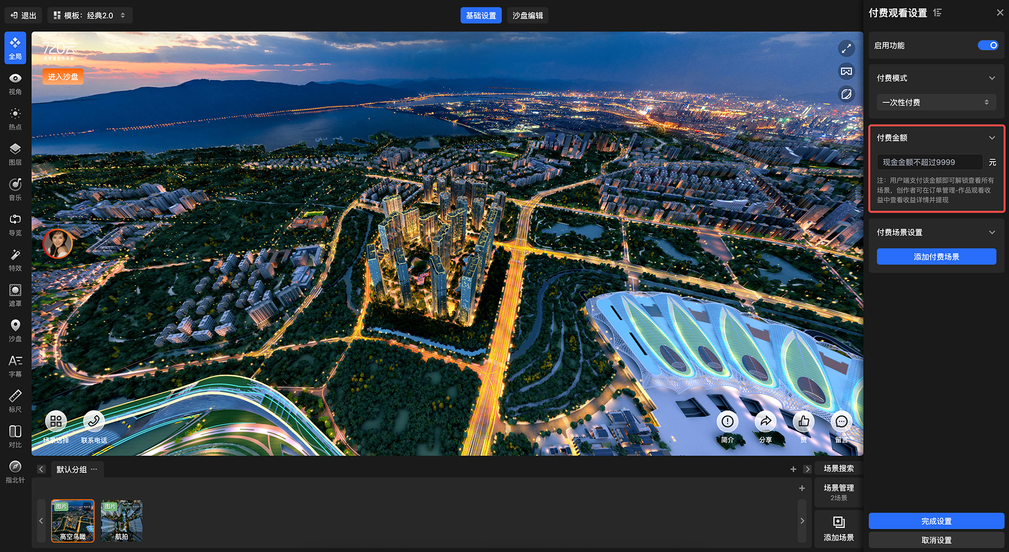 720漫游【全局设置-付费观看设置】中付费金额上限由之前的999元扩充到9999元,满足一些大型项目的更高定价的付费观看服务。
